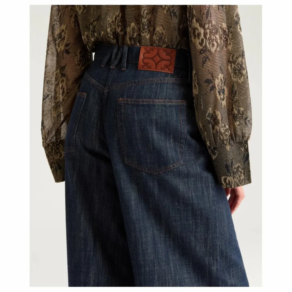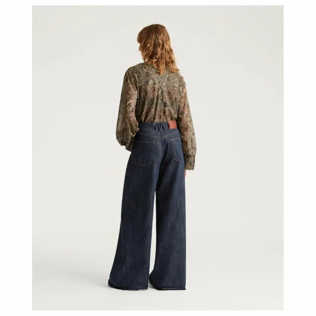 - Pantalon 5 poches en denim teinté fil. Jambe longue et droite, sangle construite, passante en M à l’arrière avec des poutres contrastées, ouverture avec bouton-clou logé, rivets et zip.