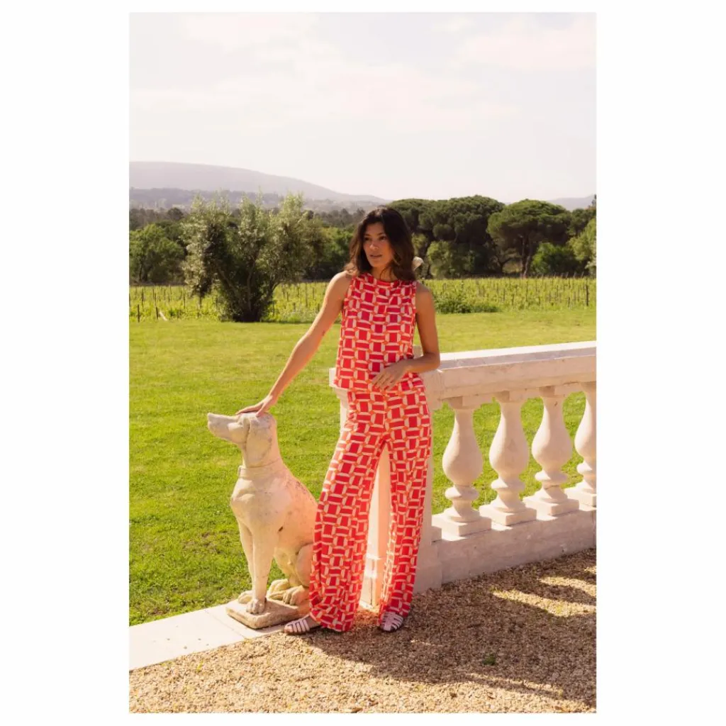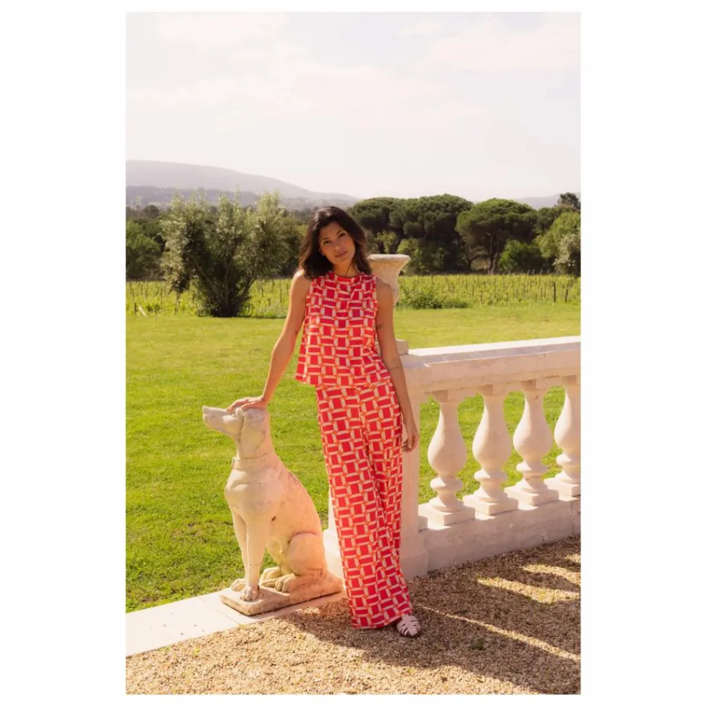 Le top Paolina est le nouvel essentiel de votre été. La matière, en jersey fluide et doux, est ultraconfortable. Il se porte aussi facilement sous un blazer pour aller au bureau, en combo avec le pantalon Andrea du même imprimé pour un effet total look, ou bien tout simplement avec un short en jean pour une tenue plus décontractée.– Col rond ouvert avec une finition au dos en forme de goutte surplombé d’un gros bouton doré cousu ( la goutte ne s’ouvre pas car le col est déjà très ouvert pour le passage tête).