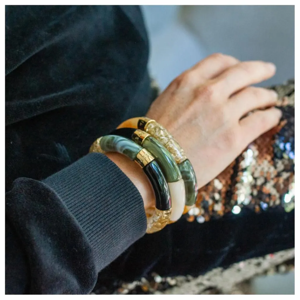 - Bracelet composé de perles acryliques ou résine et d’une perle en acier au logo de la marque PARABAYA