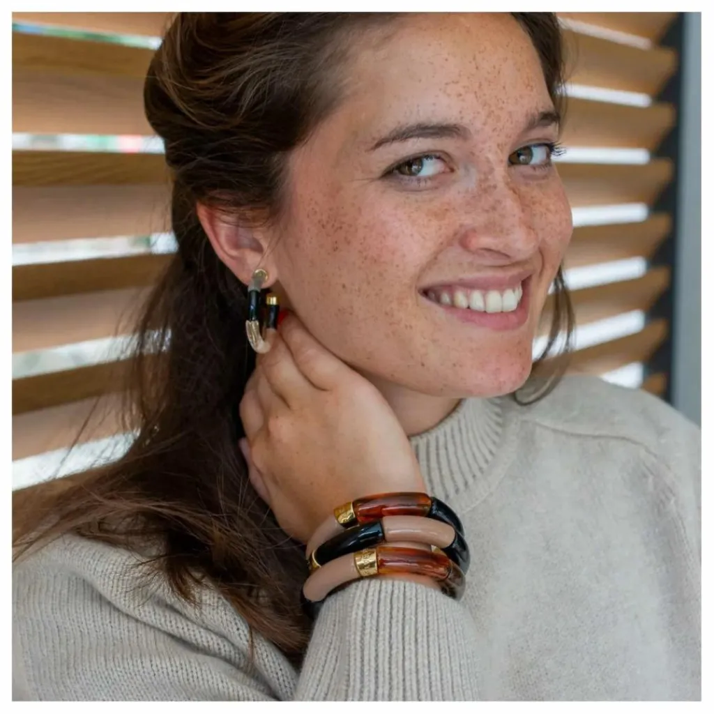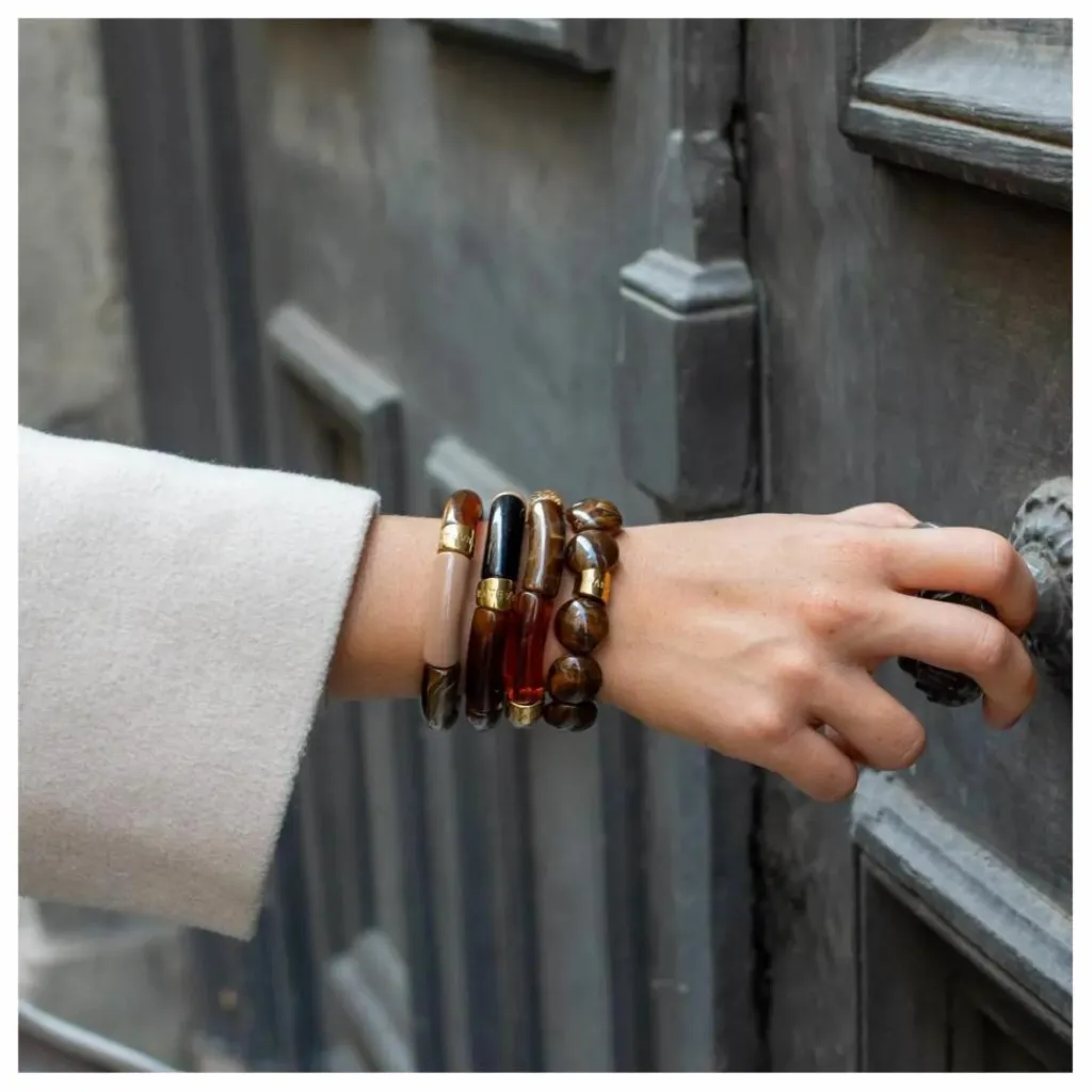 - Bracelet composé de perles acryliques ou résine et d’une perle en acier au logo de la marque PARABAYA