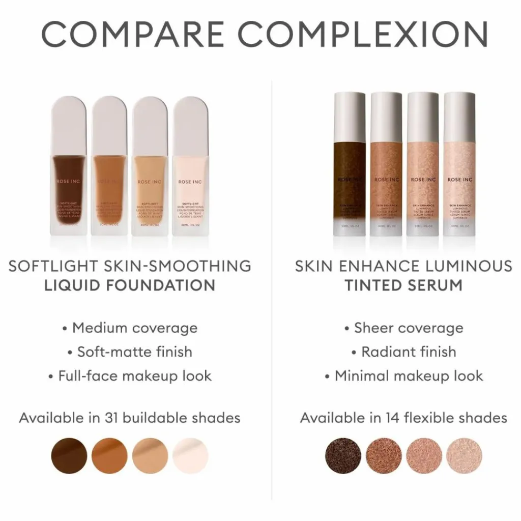 - Associant un soin puissant à des sphères de pigments micro-encapsulés, le sérum teinté lumineux de Rose Inc Skin Enhance est un sérum hydratant ultra-léger qui offre une couvrance transparente à légère, tout en aidant à obtenir une apparence lisse et radieuse. Cette formule non comédogène aide à repulper la peau, à atténuer l’apparence des ridules et à favoriser un grain de peau plus lisse. Appliquée par tamponnement sur la peau, elle aide à estomper les imperfections pour donner au teint un aspect aérographe et un fini radieux et lumineux.