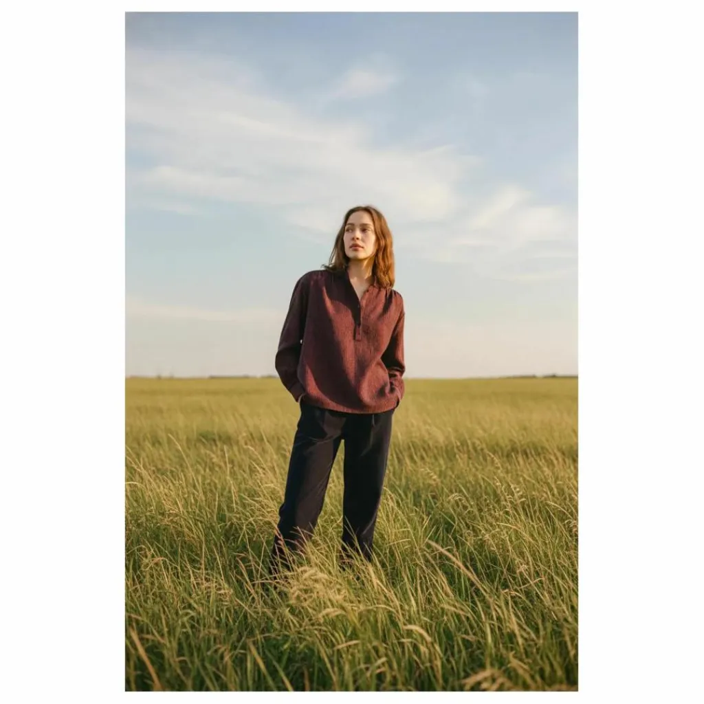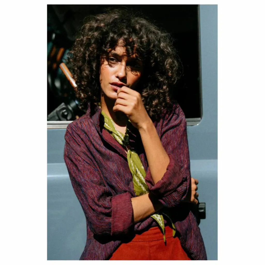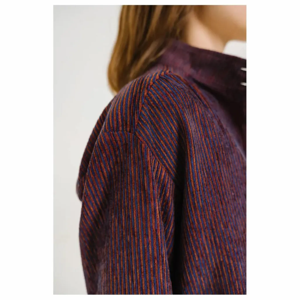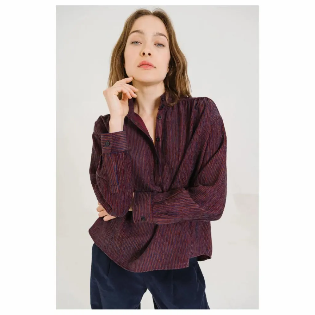 - Blouse à col montant, confectionnée en velour rayé rouge et bleu. Sa coupe ample et ses emmanchures basses lui confèrent une allure fluide et décontractée. Froncée à l’avant et au dos, elle est soulignée par une patte polo et des bas de manches fermés par un bouton, pour une finition subtilement féminine.