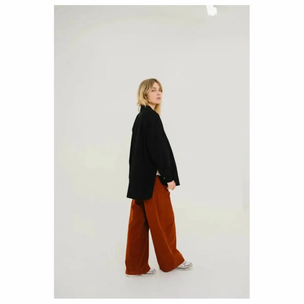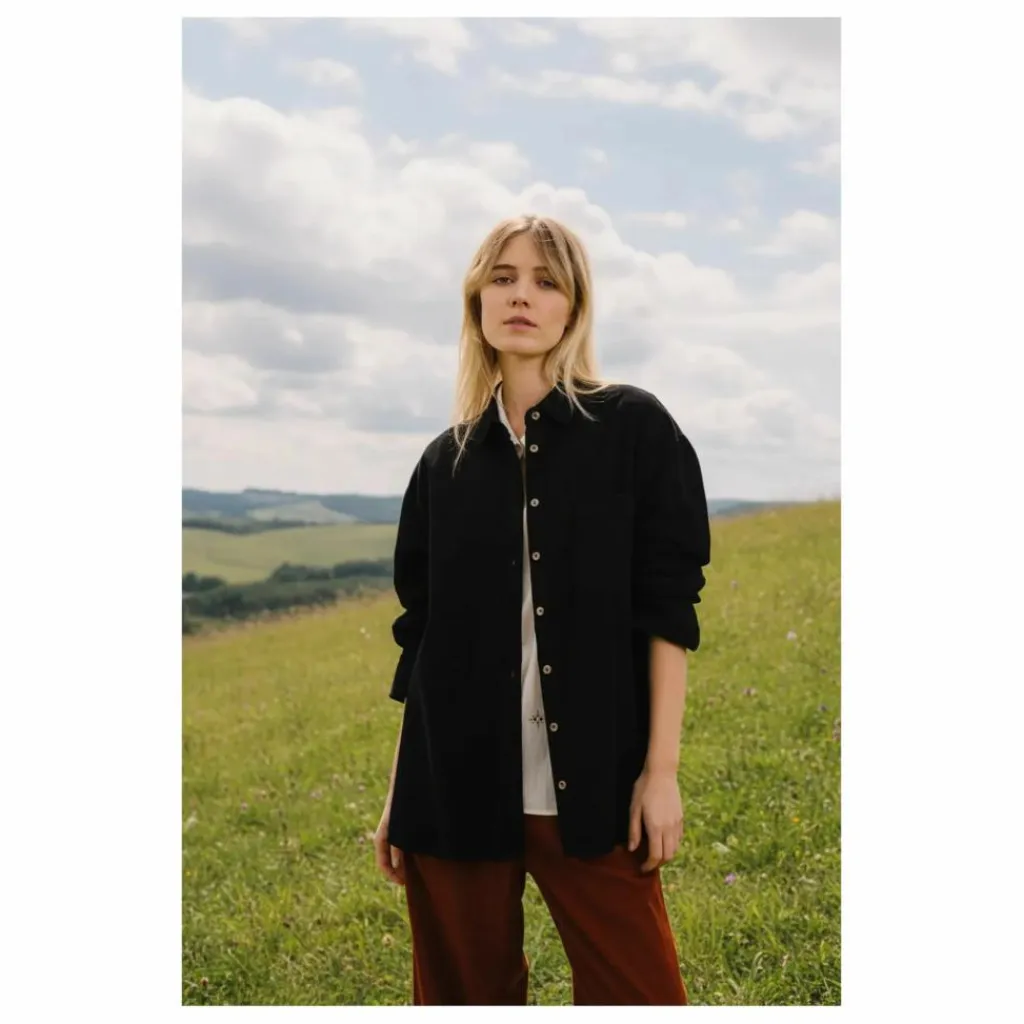 - Chemise longue style tunique en baby velours de coton noir, au toucher doux et velouté. Sa coupe fluide se distingue par un dos légèrement plus long que le devant, des fentes côtés et un double pli au dos pour plus d’aisance. Dotée d’un col classique et d’une poche poitrine, elle allie confort, chaleur et élégance décontractée.