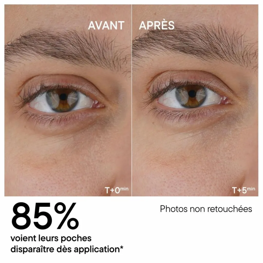 - La pigmentation des cernes est réduite, les poches disparaissent, le contour de l’oeil est lissé et visiblement plus lumineux.