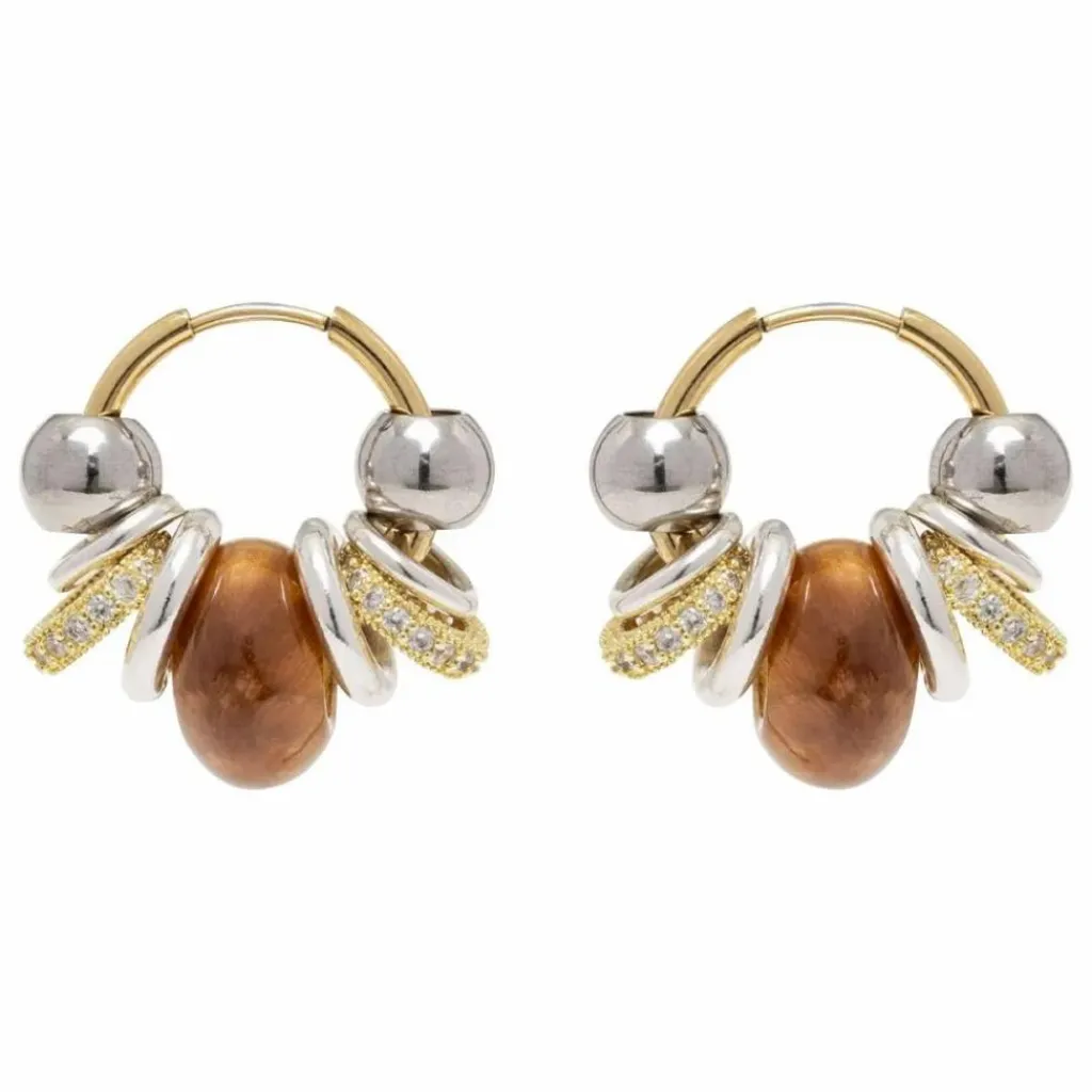 - Les boucles d’oreilles Hoops Bubble Shiny Camel se composent d’une perle oeil de tigre, entourée de perles argentées et d’anneaux dorés et argentés.