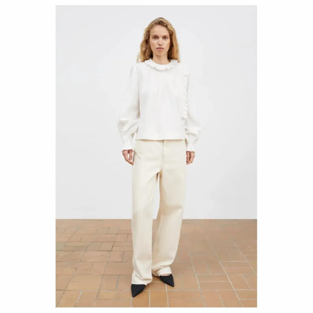 - Ce chemisier ample aux manches volumineuses est fabriqué en coton 100 % biologique. De délicats volants bordés de dentelle sont rassemblés autour du cou et des poignets, ainsi que le long des boutons en nacre qui descendent d’une épaule. Des pin-pucks se poursuivent à partir du col, ce qui permet au devant de s’évaser délicatement jusqu’à la taille.