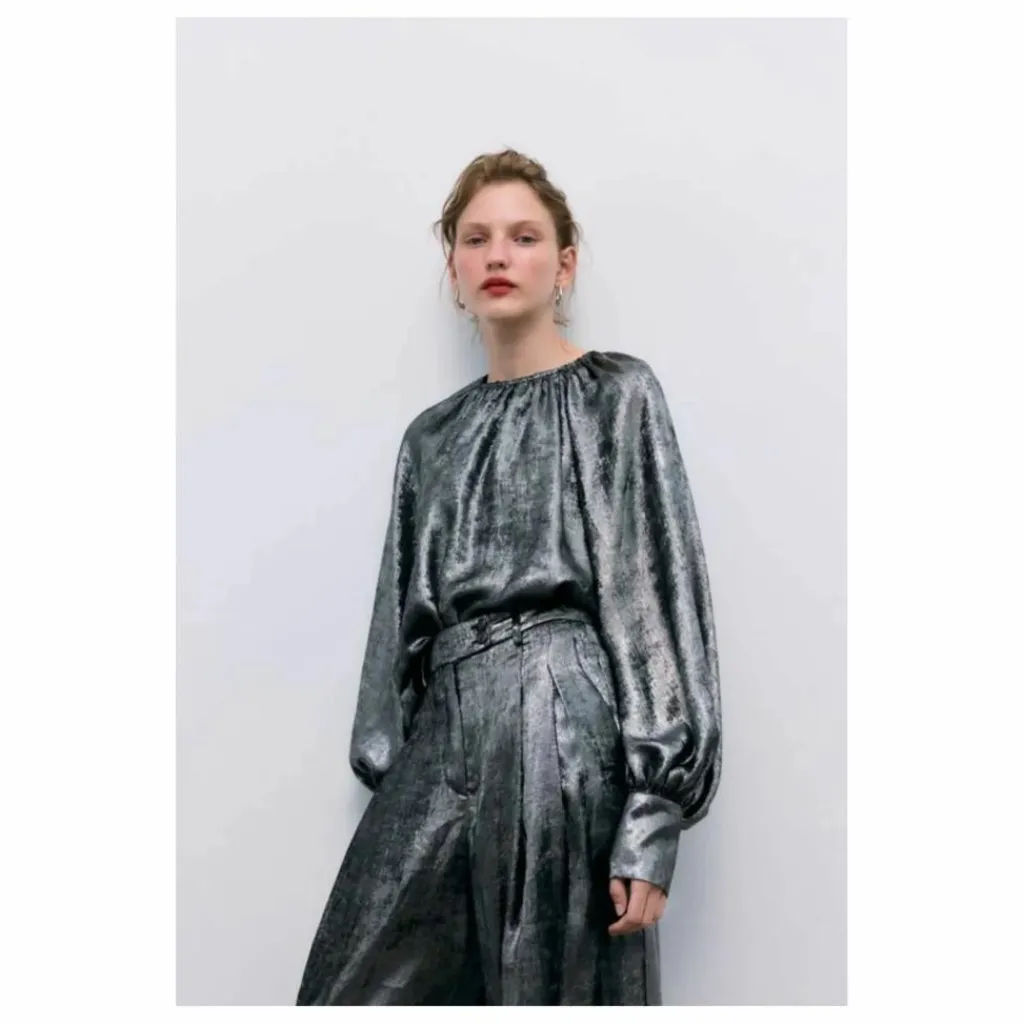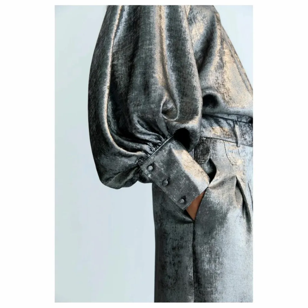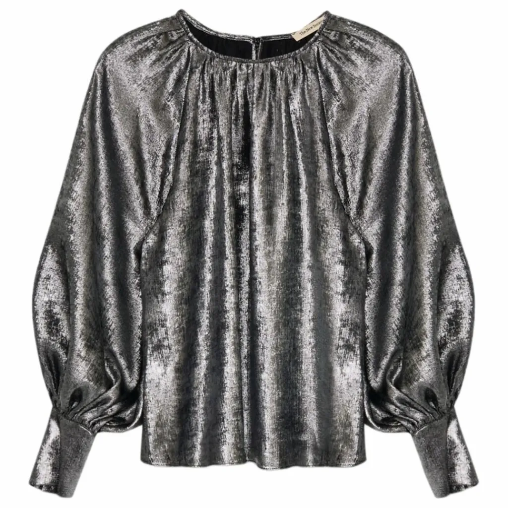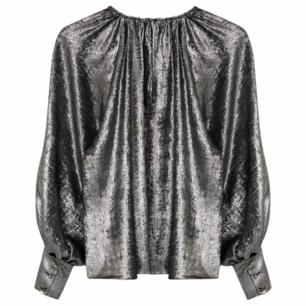 - Chemisier argenté à encolure ronde et détails froncés, manches bouffantes à larges poignets et boutons recouverts dans le même tissu. Ouverture au dos par un trou de serrure et un bouton.