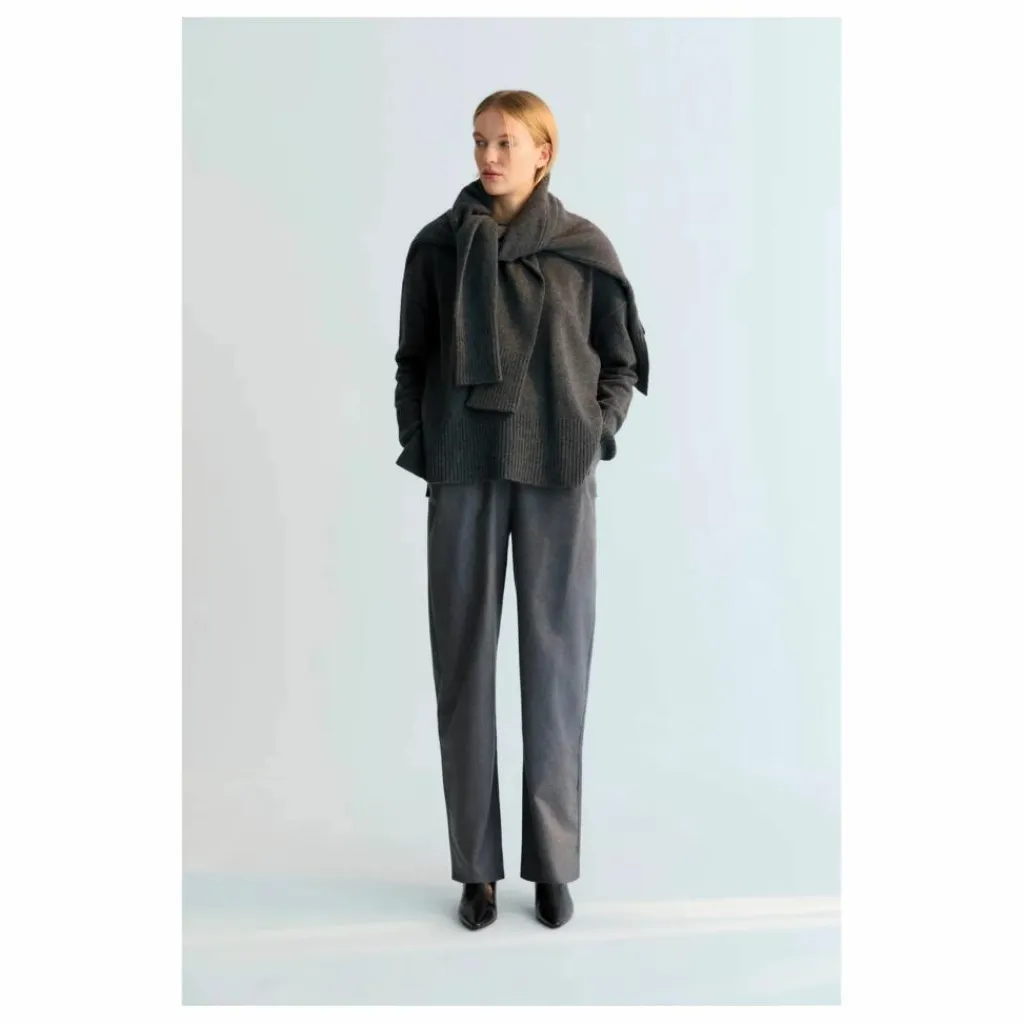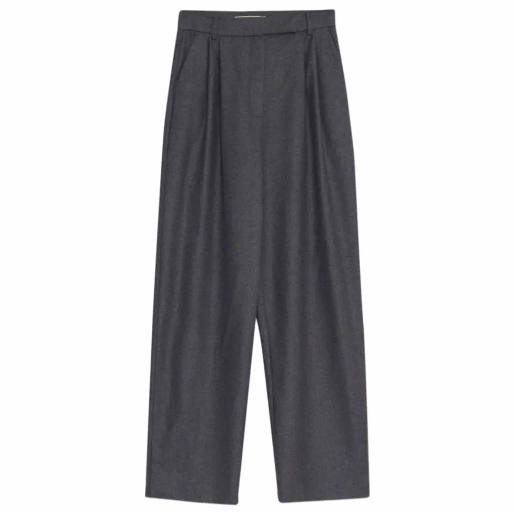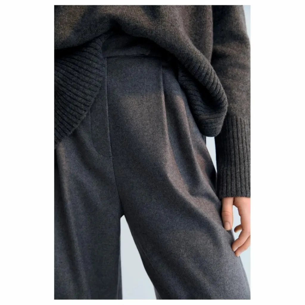 - Pantalon en laine avec plis sur le devant et poches latérales. Il est doté d’une ceinture avec fermeture à bouton caché.