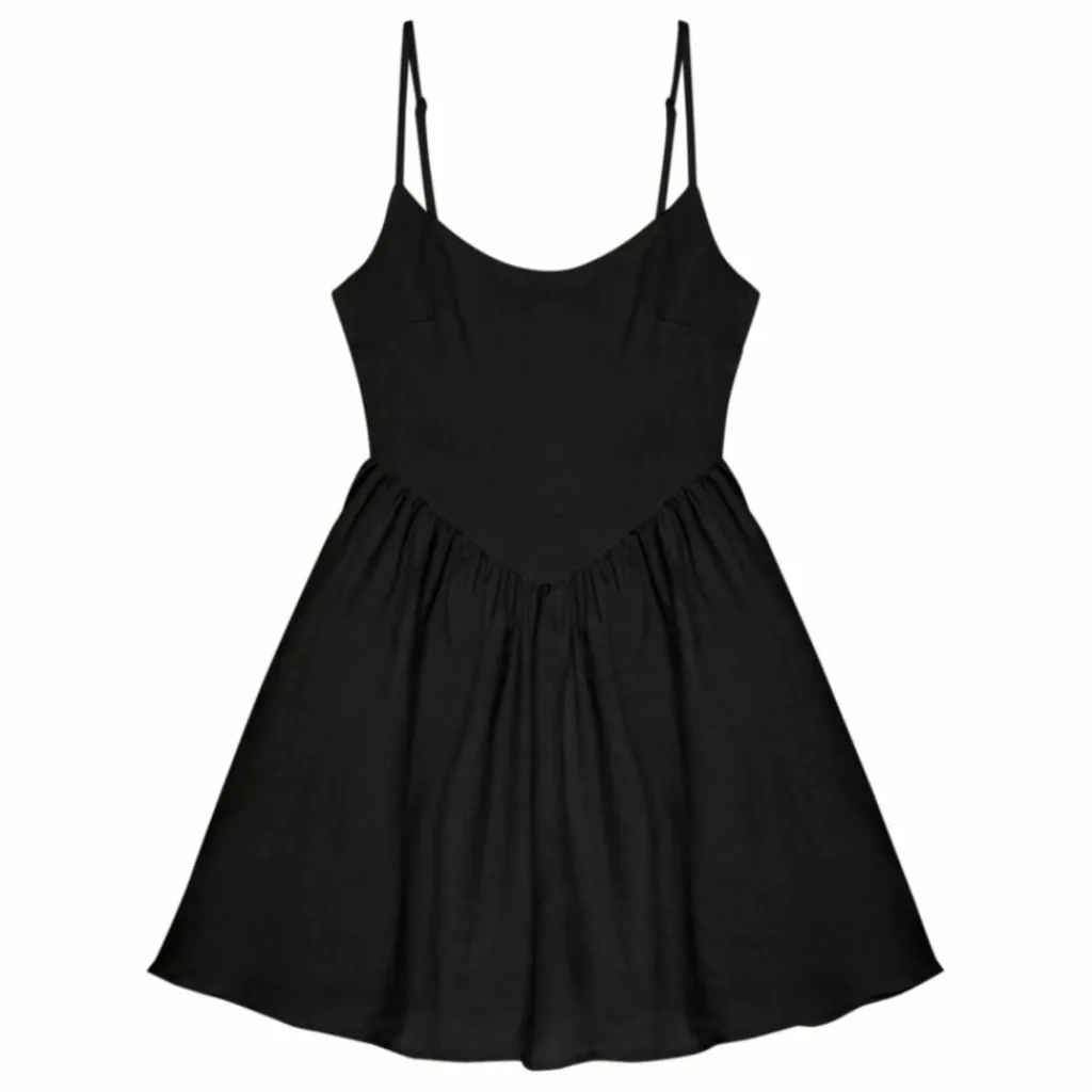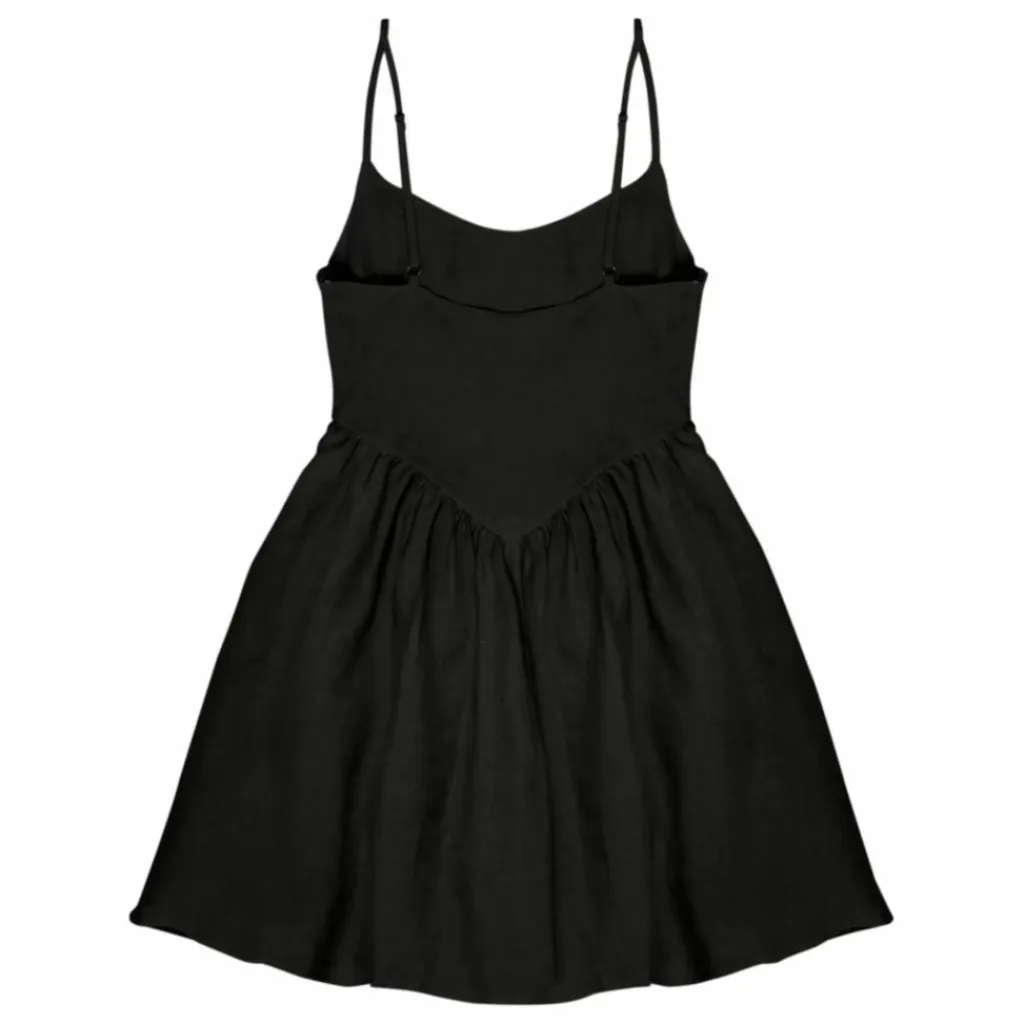 - Robe courte Hera Woman en 100% lin, disponible en trois couleurs : caviar, macadamia et palmier. Encolure carrée, bretelles avec attaches et jupe courte avec volume.
