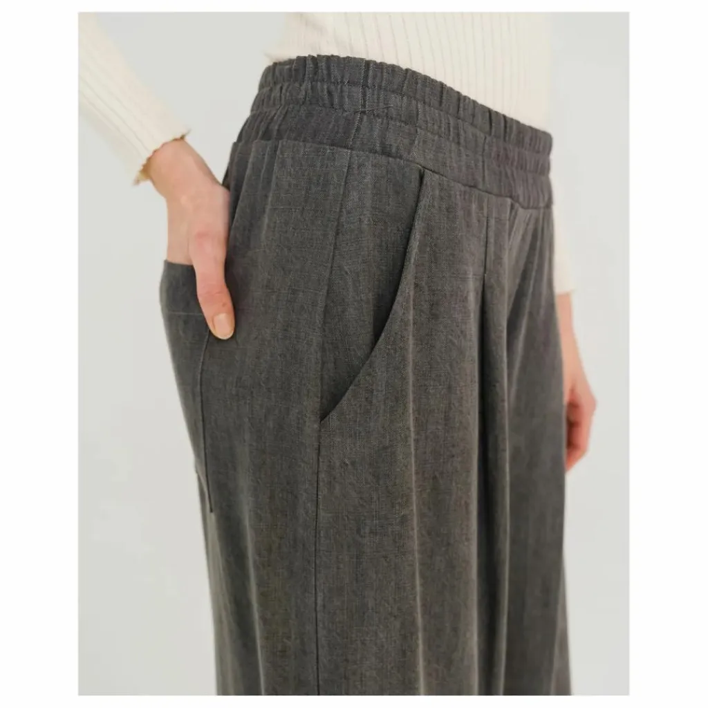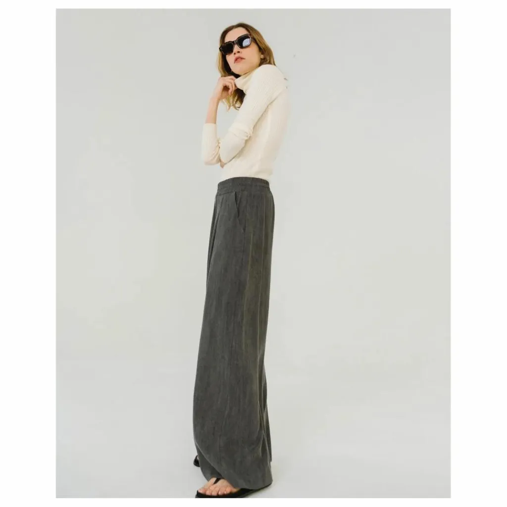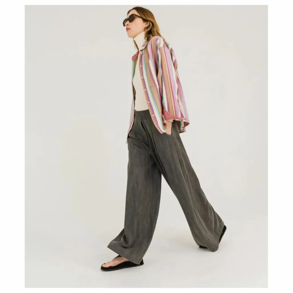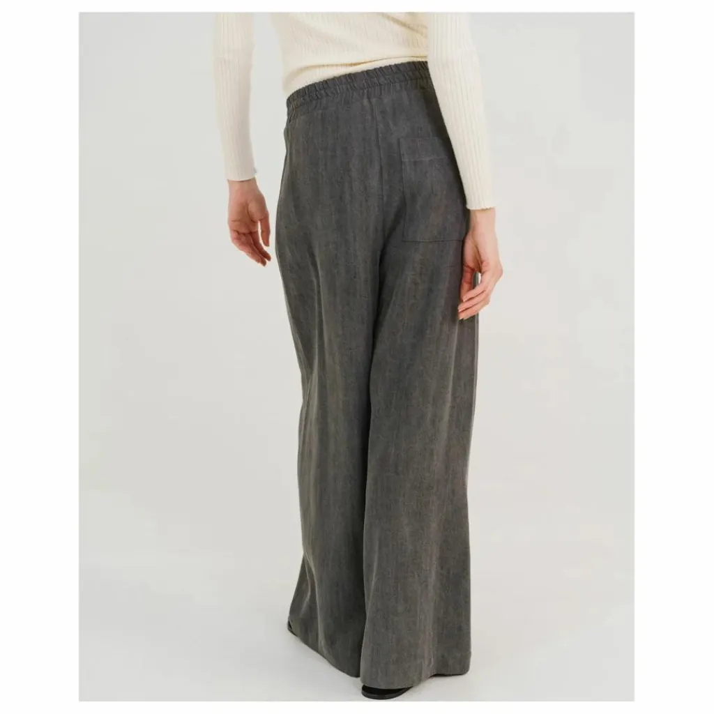 - DEVRIG est un pantalon à taille élastiquée, larges plis devant pris dans la ceinture, jambe large et droite. Poches ITnnes devant, une poche plaquée au dos. Ce pantalon est coupé dans une toile denim 100% Lyocell, fluide et féminine.