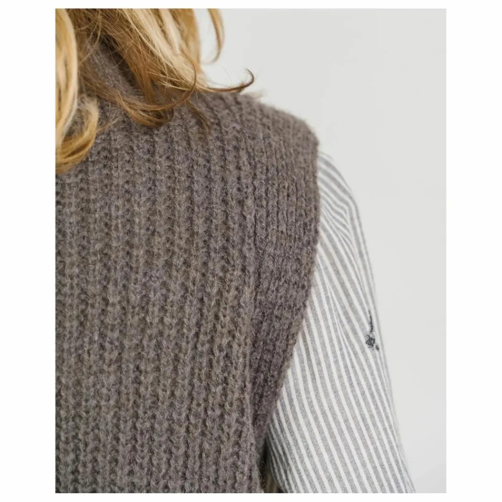 DJOAN est un pull sans manches à porter sur une chemise ou une robe. Un joli détail de tricotage aux emmanchures lui donne beaucoup de caractère. Parfait pour la mi saison et plus si affinité. Ce pull est tricoté dans un fil italien, en Italie. Maille ultra douce, résistante et chaude