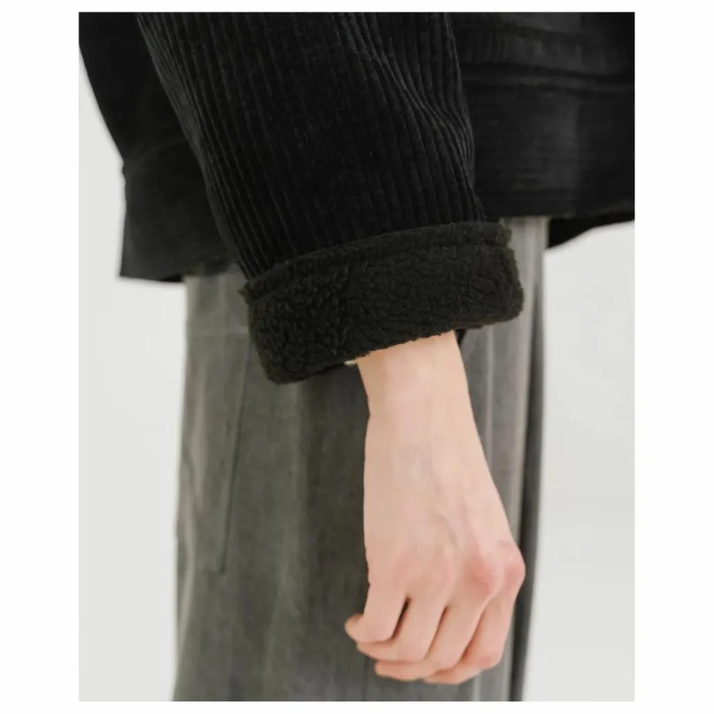 - DOUDOU est un blouson en velours effet mouton retourné, légèrement loose avec un large col, boutons effet cuir et poches plaquées sur le devant. Manches longues. DOUDOU est coupé dans un velours grosses côtes avec un contre collage effet mouton retournée, tissé en Italie.