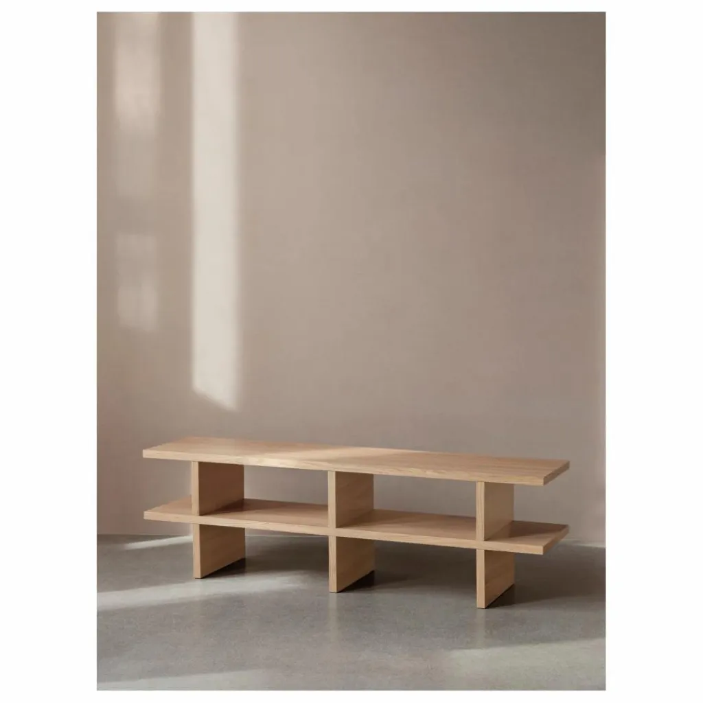 Le banc Kona vient compléter la série Kona en offrant un mélange de fonctionnalité et de style imprégné de l’esthétique japonaise. Le produit est certifié FSC® et fabriqué en placage de chêne avec une âme en MDF. Ce banc est conçu pour être polyvalent. Le rangement ouvert sous l’assise est idéal pour ranger des livres dans un salon, des chaussures dans une entrée ou comme rangement supplémentaire élégant au pied d’un lit.