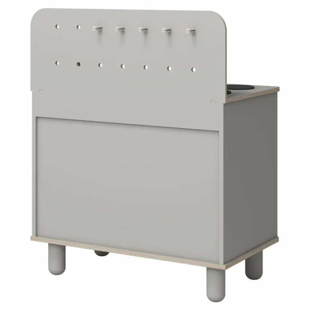 Les ustensiles de cuisine peuvent être suspendus à la paroi arrière, les casseroles et les poêles peuvent être rangées derrière le rideau, l’évier peut être retiré et utilisé comme récipient, et les boutons de la cuisinière émettent même un clic réaliste lorsqu’on les tourne.