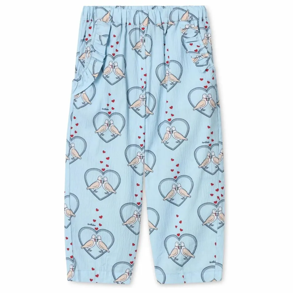 - Pantalon en qualité imprimée douce et texturée. Le pantalon a un élastique à la taille et des poches latérales avec un joli volant. Le pantalon descend jusqu’aux chevilles et a une coupe ample qui le rend agréable à porter. Le nom Colombe est français et signifie colombe, car l’imprimé se compose de deux colombes assises dans un cœur.