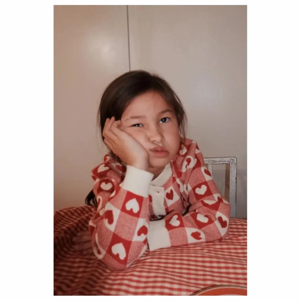 - Le cardigan Heart est en coton. Il apporte confort et chaleur, avec un adorable motif de carreaux et de cœurs. Il présente des manches régulières, un col rond et se ferme sur le devant à l’aide de boutons rouges.