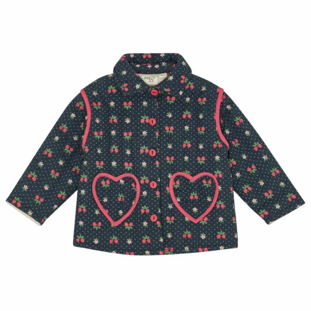 - La veste Sofia est une veste parfaite pour la saison, dotée d’un léger rembourrage matelassé et d’un joli imprimé fraise. La veste a des bords contrastés rouges, des poches en forme de cœur sur le devant et se ferme à l’aide de boutons contrastés rouges.