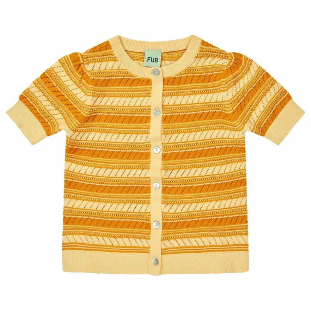- Tricoté dans une structure décorative en pointelle rayée, ce haut présente un col rond côtelé, des manches courtes avec de petites fronces sur le dessus et une fermeture boutonnée sur le devant avec des boutons en coquille perlée. Il a une coupe régulière et est fabriqué en coton biologique.