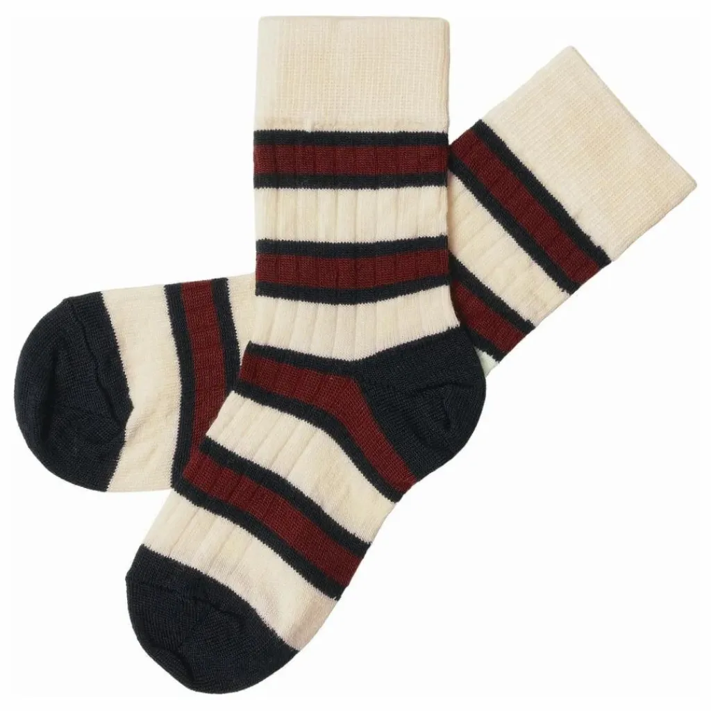 - Tricotées à partir d’un fil de laine extra fin mélangé à de l’élasthanne pour une durabilité et une excellente récupération, ces chaussettes présentent une structure côtelée classique avec des rayures et des couleurs contrastées au niveau du talon et des orteils. Les chaussettes sont renforcées au niveau des orteils et des talons, et sont dotées d’un revers ferme à double couche pour plus de confort. La laine utilisée est exempte de produits chimiques nocifs.