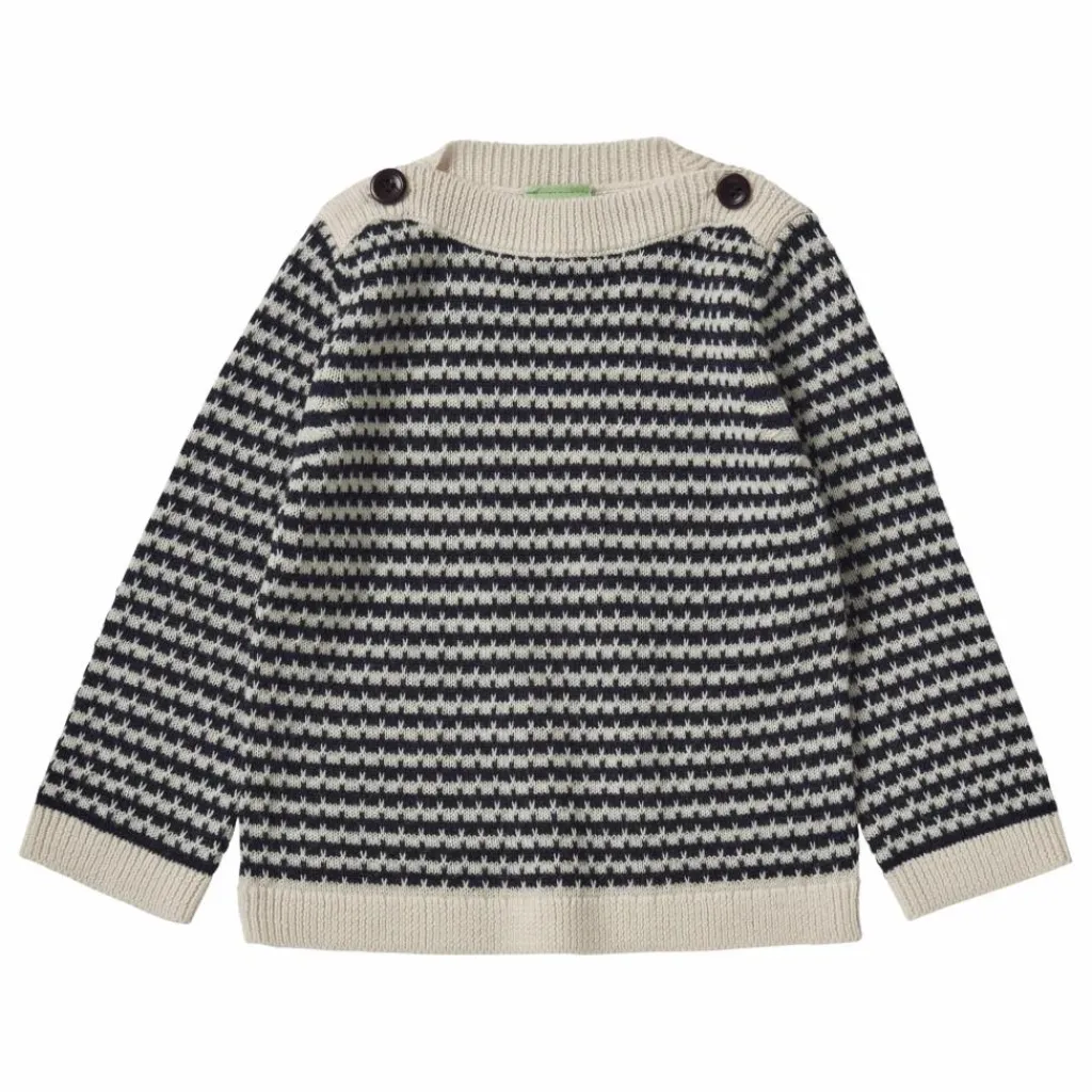 - Tricotée dans une structure douce, cette blouse classique est conçue avec des manches longues, des ourlets côtelés et un col bateau avec fermeture à bouton corozo. La blouse a une coupe droite et est tricotée dans un motif rayé bicolore. Les boutons sont fabriqués à partir de noix de corozo et sont entièrement biodégradables. Notre laine mérinos est certifiée BLUESIGN et RWS, elle est exempte de produits chimiques nocifs et provient de moutons non mulets.