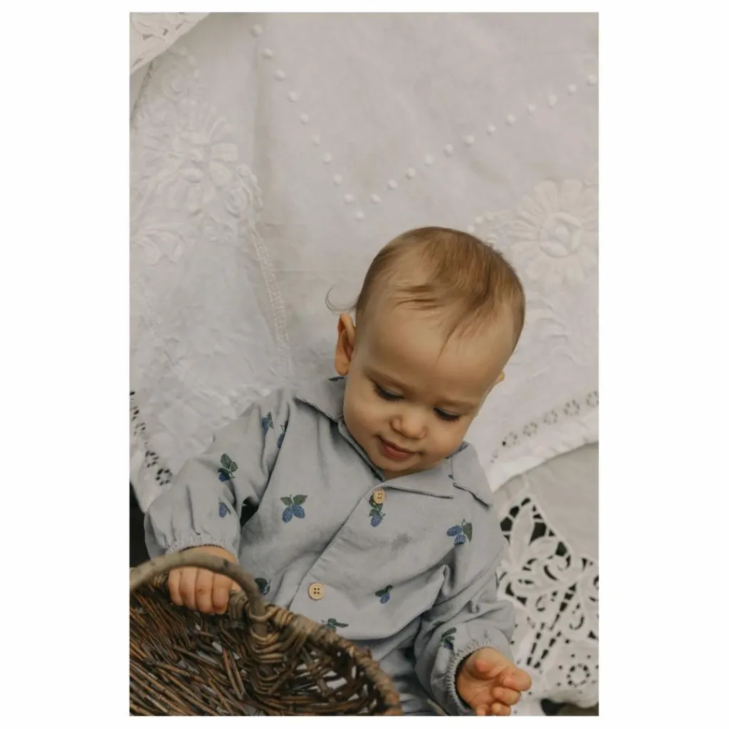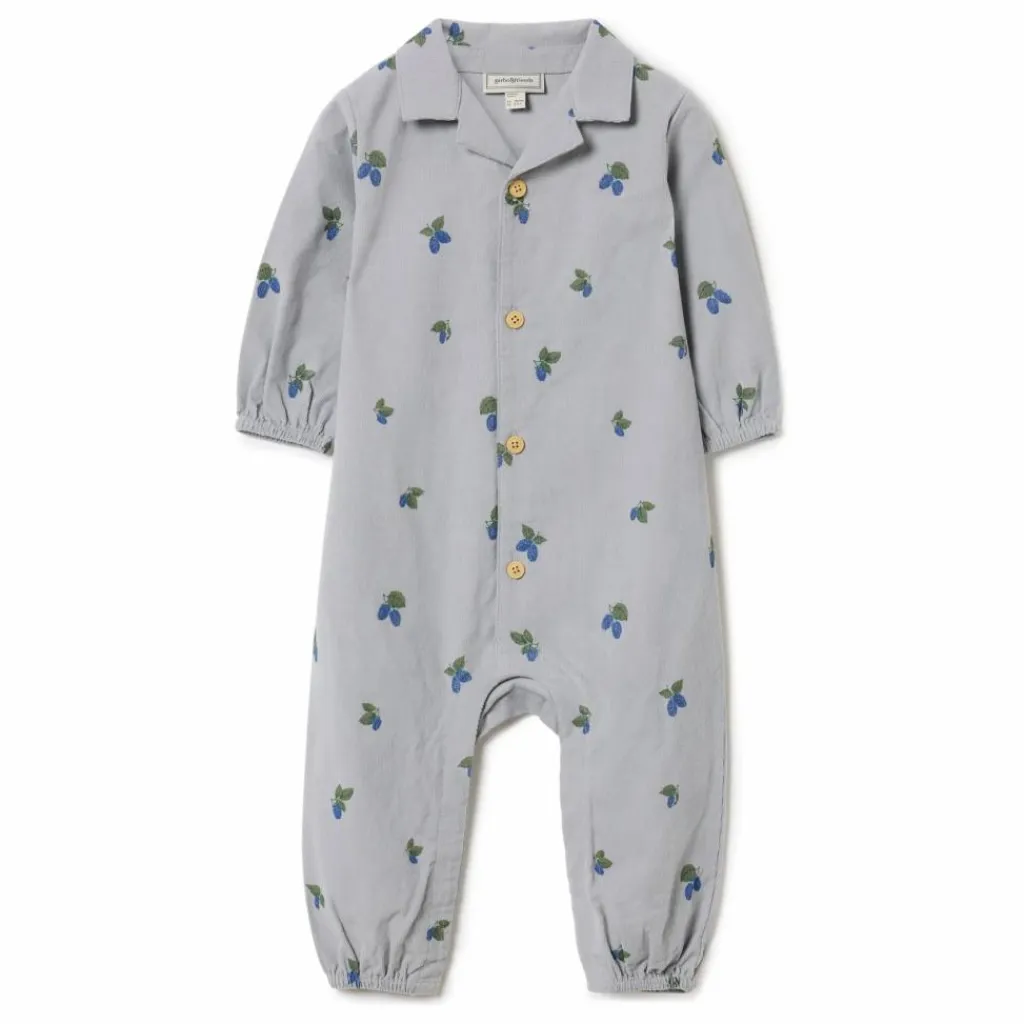 - Combinaison à manches longues en micro velours côtelé. La grenouillère est dotée d’un col en forme de station et de poignets élastiques aux extrémités des manches et des jambes, d’une fermeture à boutons sur le devant et de boutons-pression à l’entrejambe pour faciliter l’habillage et le changement de couche.