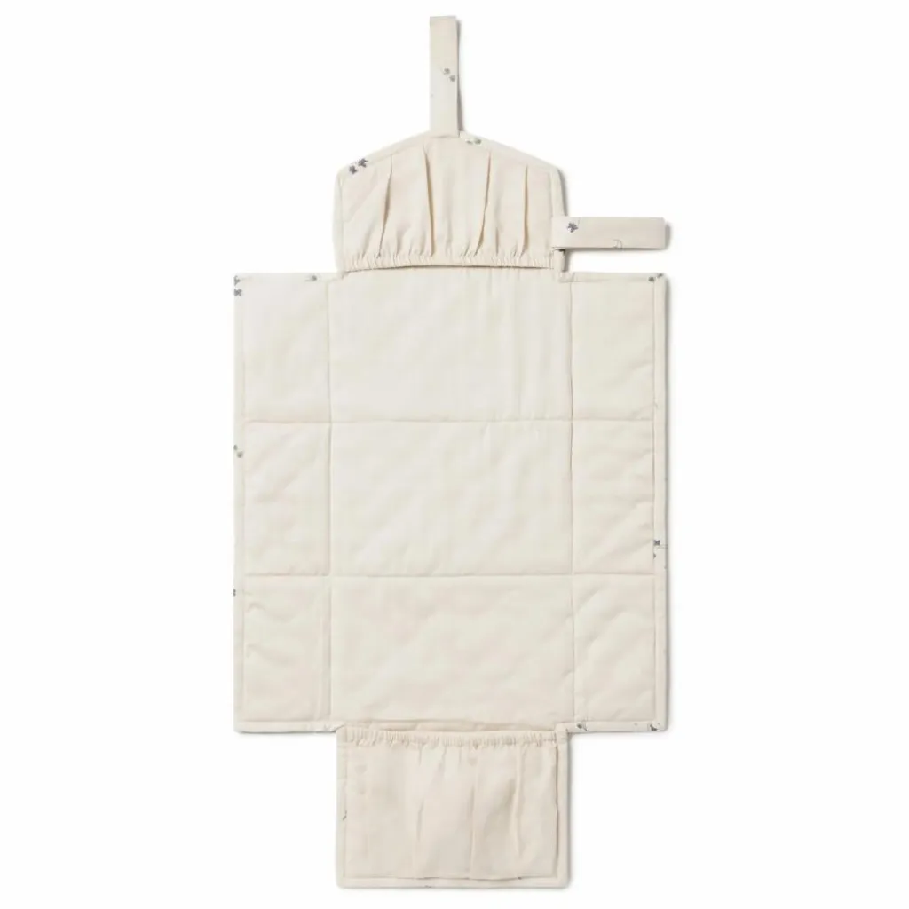 - Matelas à langer portable qui offre aux tout-petits un endroit propre et doux où s’allonger lorsque vous n’êtes pas là et qu’il est temps de changer la couche. Il est doté de poches spacieuses à l’intérieur pour ranger les couches, les lingettes et les vêtements de rechange. Fabriqué en satin de coton biologique avec le traitement BIONIC-FINISH® ECO qui le rend hydrofuge et anti-salissures.