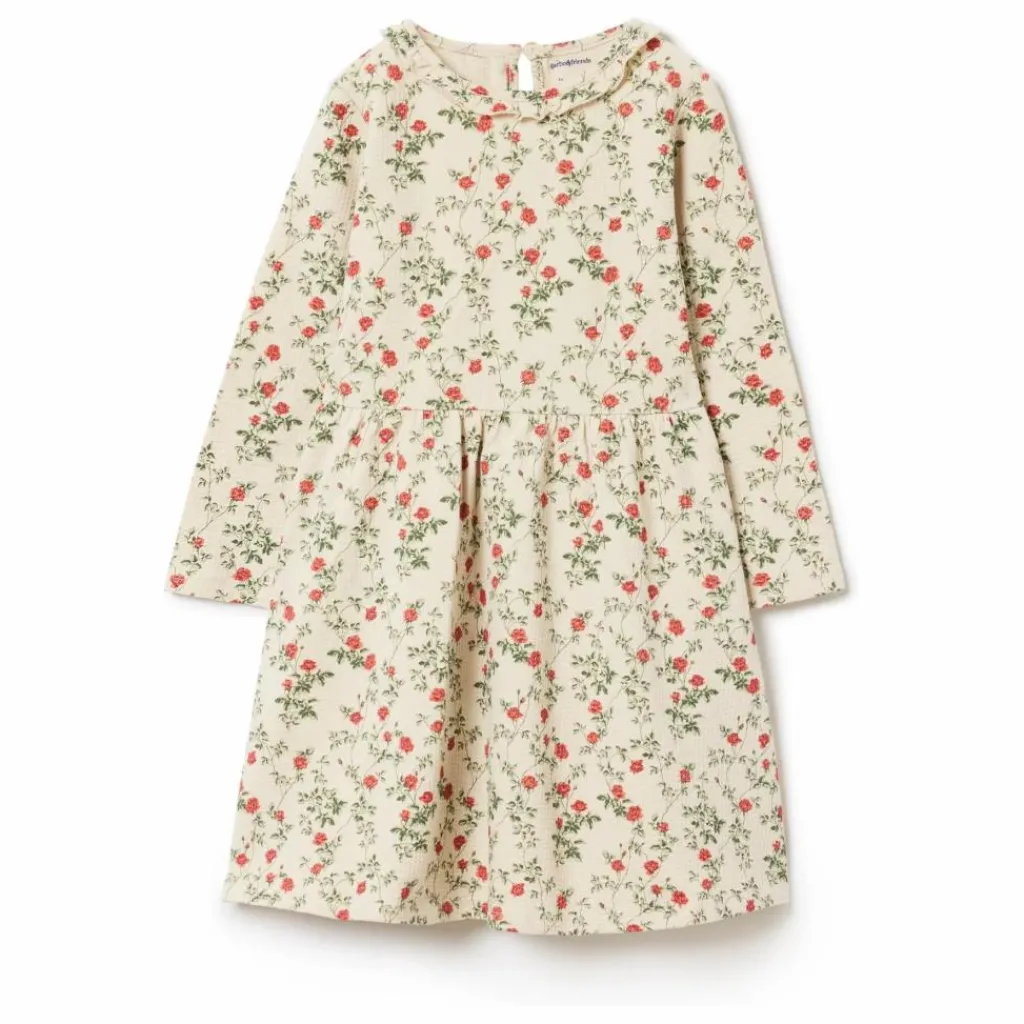 - Robe structurée en jersey de coton biologique doux. Elle présente des volants décoratifs à l’encolure, des manches longues et un boutonnage au dos.
