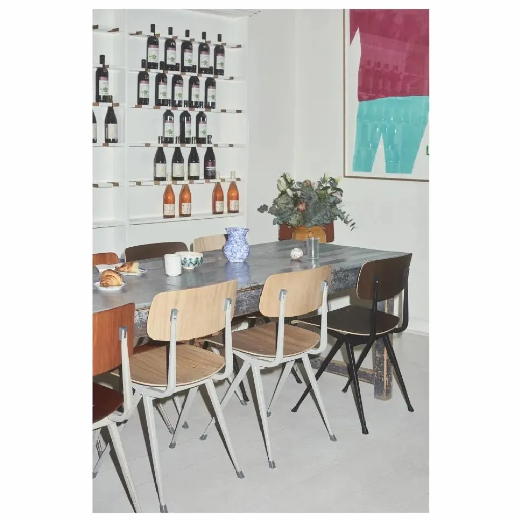 La chaise Result rééditée de son originale créée dans les années 50 par Friso Kramer et Wim Rietveld, a un vrai design rétro qui s’accorde parfaitement avec la table Pyramid. Flexible, légère et robuste, elle offre un vrai confort.