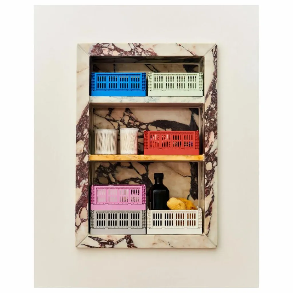 - HAY Colour Crate Mini est une série de boîtes de rangement colorées au design distinctif et perforé. Fabriquées à partir de déchets plastiques post-consommation 100 % recyclés, dans le plus petit format disponible dans la collection Colour Crate, les mini-caisses s’insèrent dans les grandes caisses et peuvent être empilées les unes sur les autres. Ces caisses multifonctionnelles conviennent au rangement et à l’organisation d’un large éventail de petits objets sur des étagères, des tables ou à l’intérieur d’armoires.