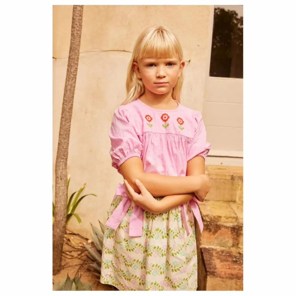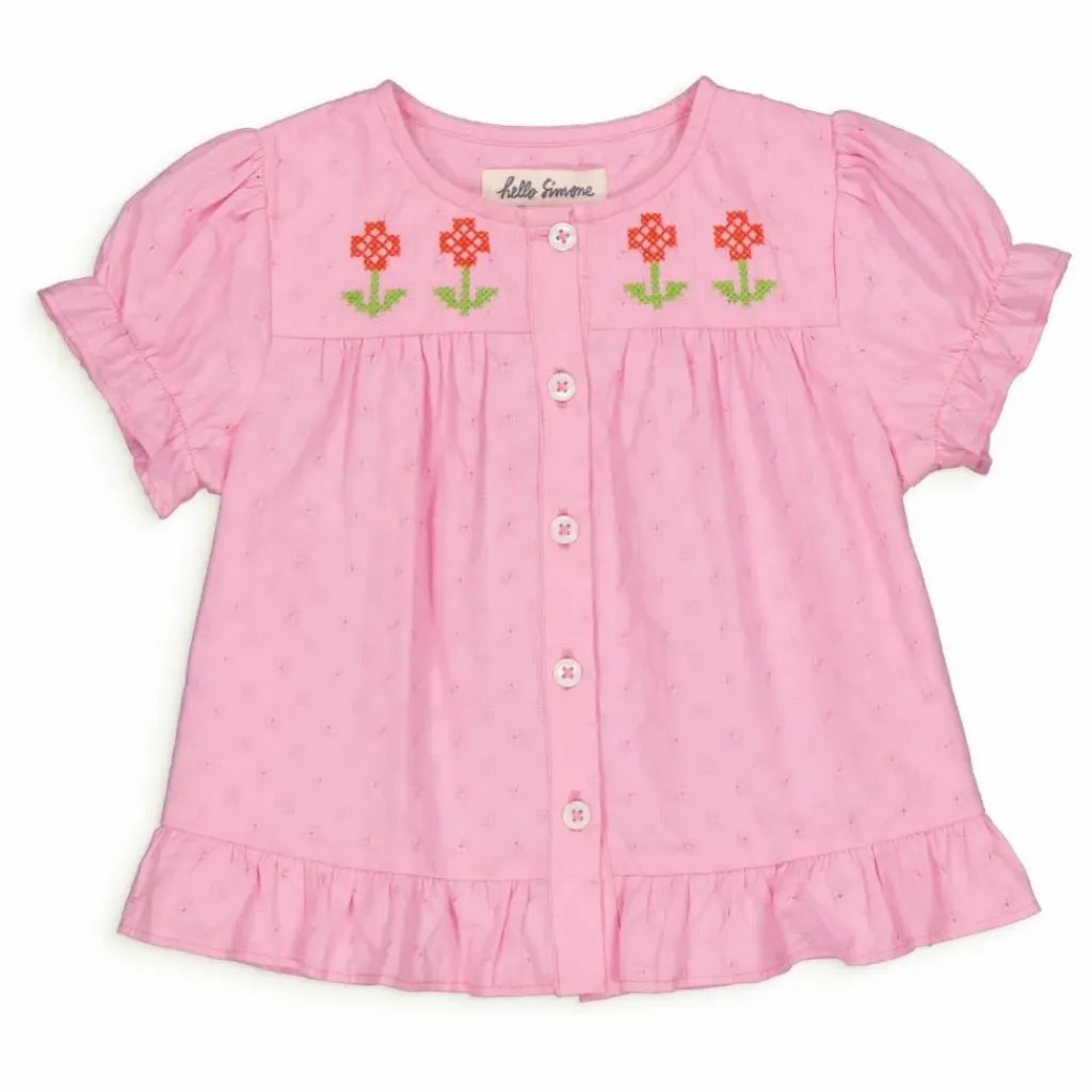 - Chemisier en ratière pour bébé avec empiècement plat et fronces au niveau du bas. Broderie de fleurs sur l’empiècement avant et sur le devant boutonné. Manches courtes froncées avec smocks et volants.