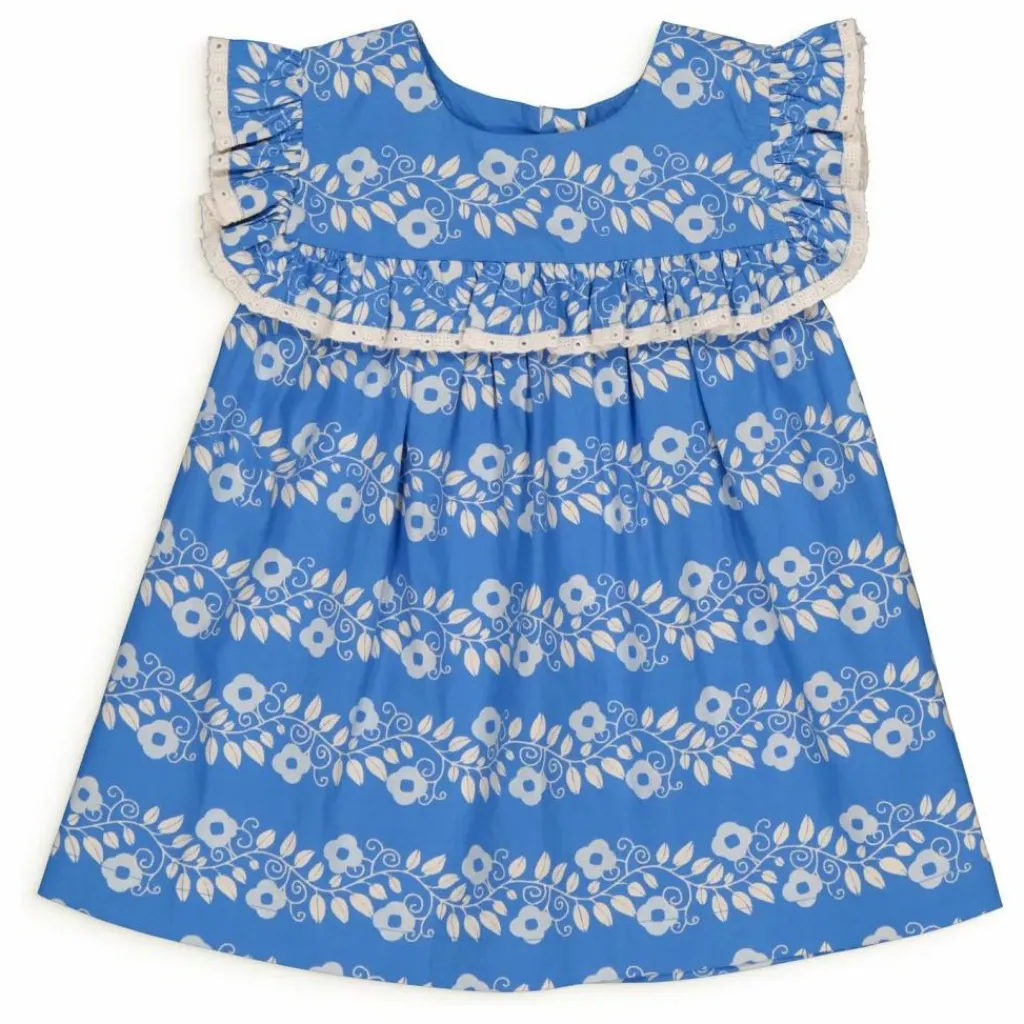- Robe de bébé en popeline à imprimé all-over avec empiècement plat et volant avec broderie anglaise sur le pourtour.