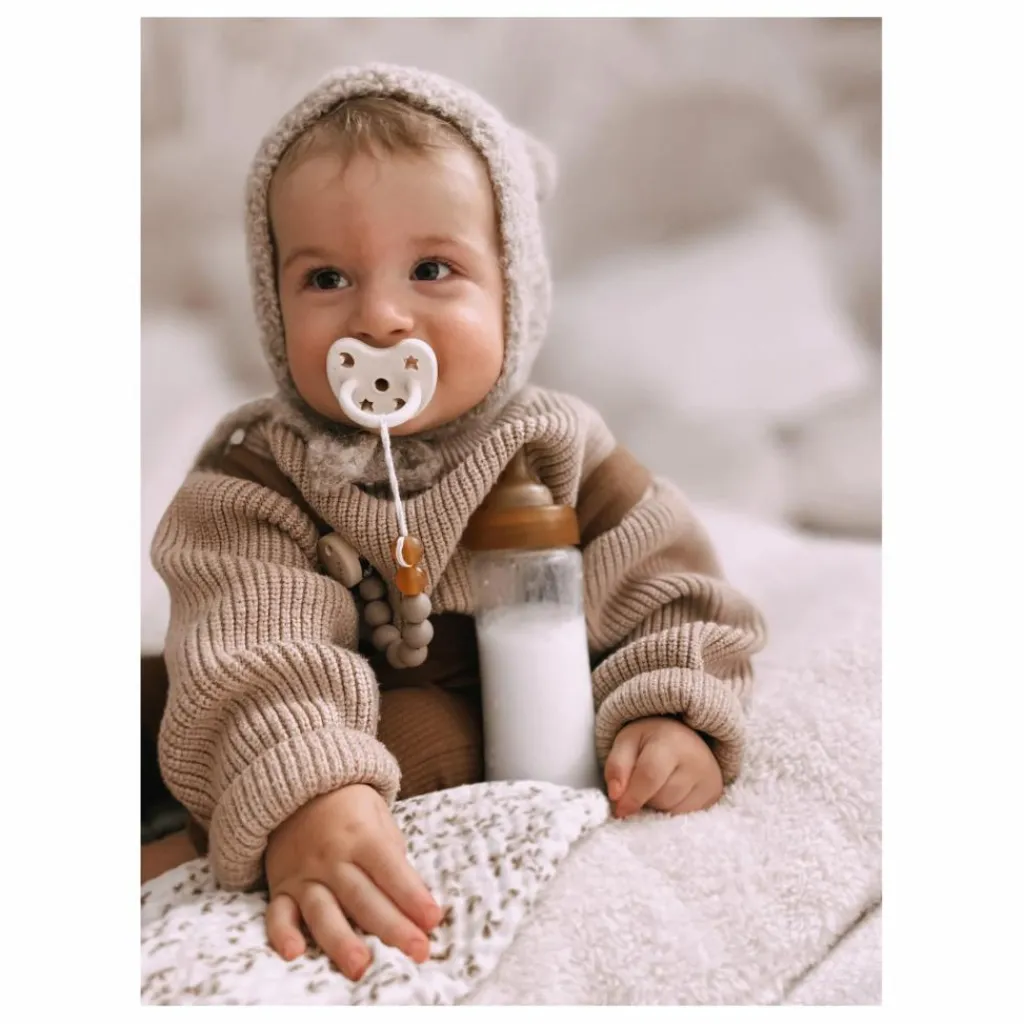 Ces deux tétines en caoutchouc naturel garantissent douceur au toucher et respectent le visage et les lèvres de votre bébé. Les formes amusantes découpées sur la face garantissent la sécurité de votre bébé tout en lui permettant de s’amuser !
