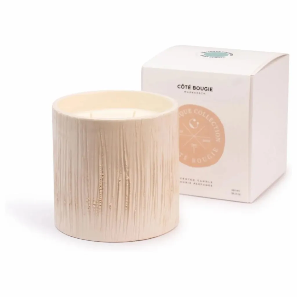 La Bougie parfumée Striée Blanc reflète l’élégance de la simplicité. Son pot en céramique, façonné et strié à la main par nos artisans de Marrakech, dévoile de fines lignes texturées qui jouent avec la lumière de la flamme. Bougies disponibles en 4 tailles : 60h / 90h / 120h / 400h
