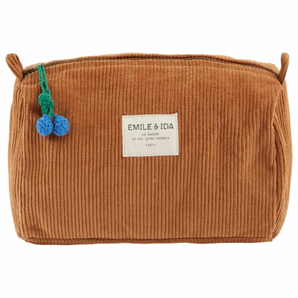 - Trousse de toilette en velours de coton à grosses côtes caramel. Elle est doublée avec un tissu de nylon imperméable blanc.