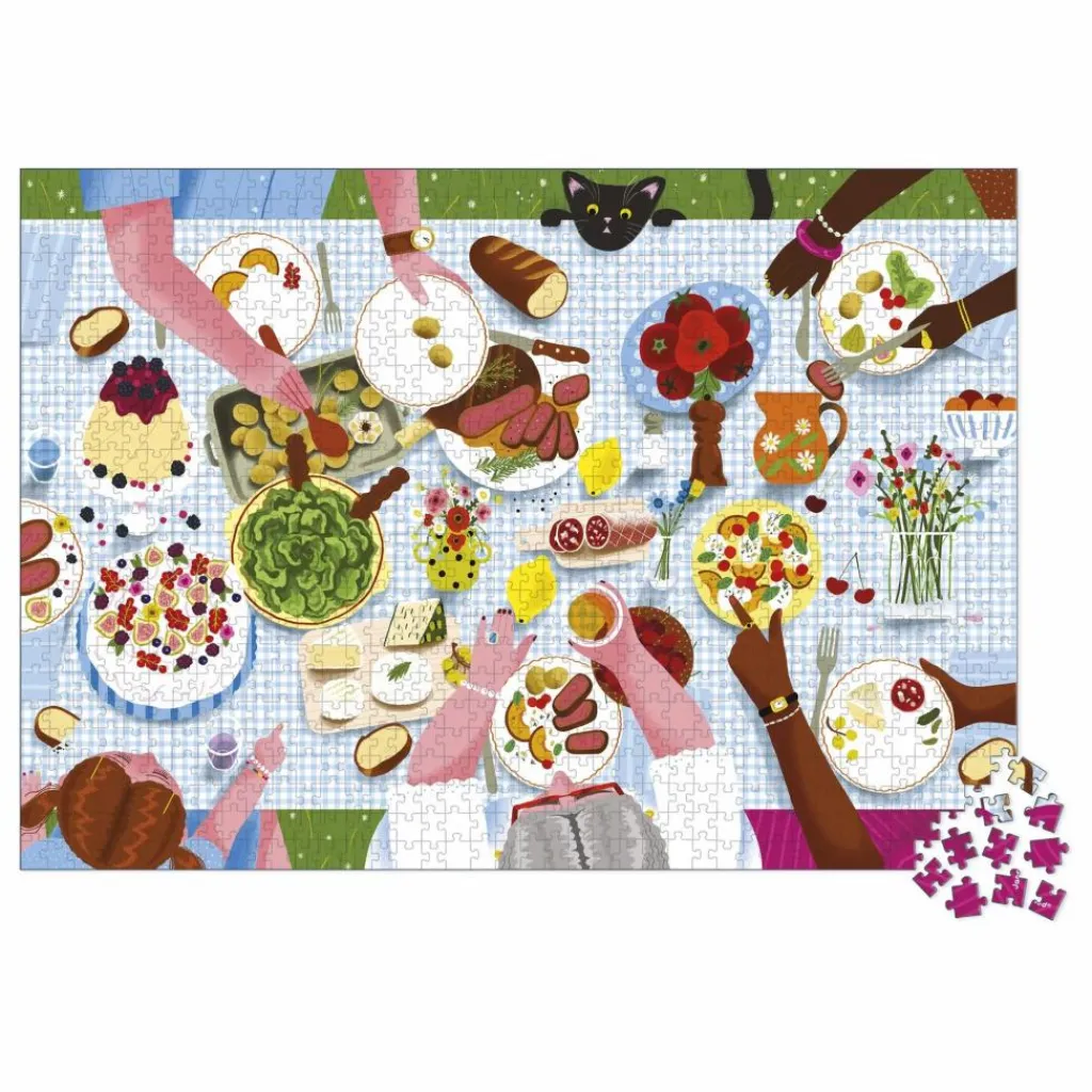 - Le dimanche, c’est repas de famille. La table est dressée, les plats dispersés et tout le monde est prêt à se régaler, même le chat n’en perd pas une miette ! Ce magnifique puzzle composé de 1000 pièces est idéal pour les enfants à partir de 8 ans. Les petites pièces requièrent minutie et dextérité pour arriver à reproduire cette jolie illustration. Seul ou à plusieurs cette activité éducative est parfaite pour développer la concentration et profiter d’un temps calme. Une fois les 1000 pièces assemblées, ce superbe puzzle fera également une très belle illustration à encadrer. Fabriqué avec du carton et papier provenant de forêts gérées durablement. Fabriqué en Pologne.