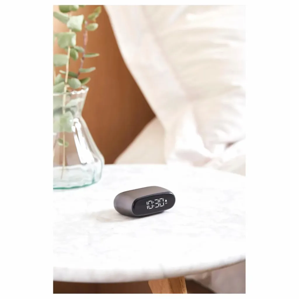 - Écran LCD noir, Commandes tactiles, Fonction snooze, Autonomie : Jusqu’à 6 mois, Temps de charge : 4h, Adaptateur secteur : USB 5V (non inclus)