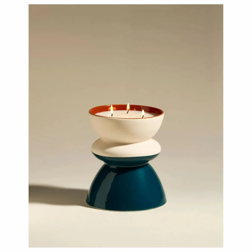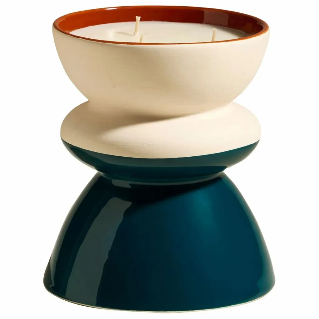 Esprit Totem. Nées de la collaboration entre Maison Sarah Lavoine et Côté Bougie, les bougies Tamtam célèbrent les racines de cœur de l’éditrice, entre tradition marocaine et couleurs parisiennes. Teintes carmin ou bleu Sarah, taille moyenne à 3 mèches ou grande à 5, ces pièces uniques, en édition limitée, illumineront chaque pièce. Ou deviendront des coupes décoratives pour fruits ou pots-pourris. Entièrement faites à la main par des artisans potiers marocains, ces bougies, en céramique émaillée et cire naturelle, embaument les espaces de leur senteur narguilé boisé. Durée de combustion : 90 heures.