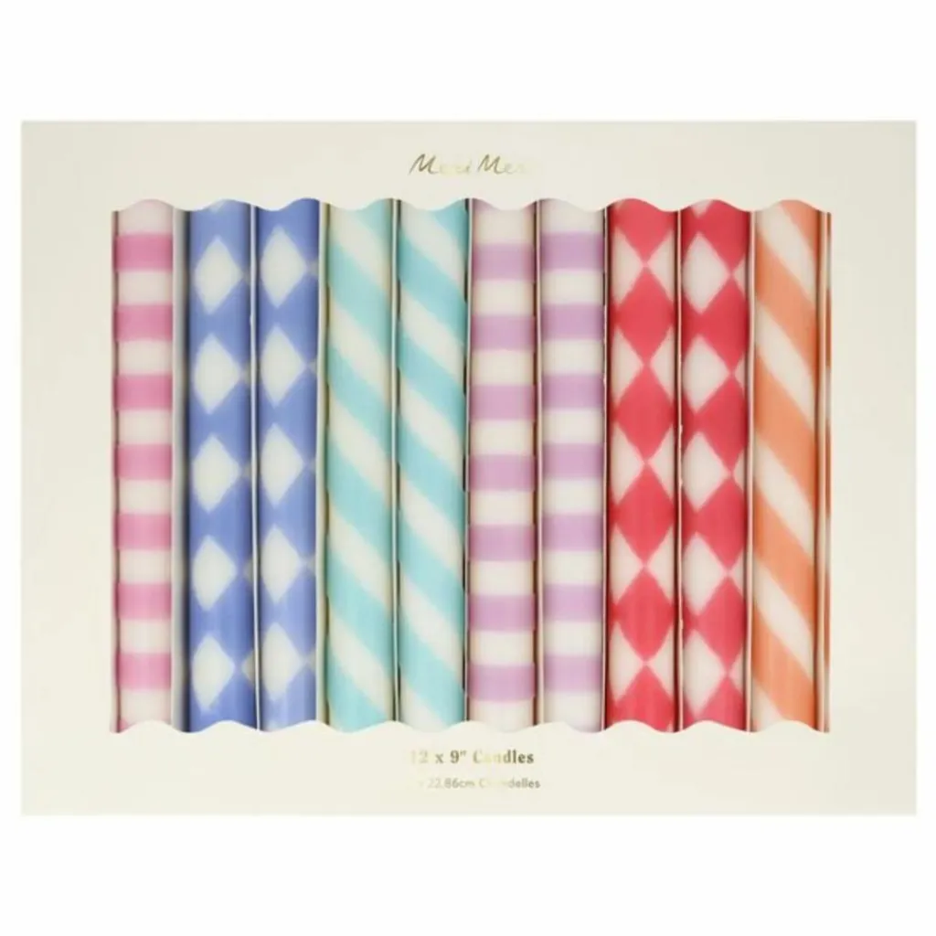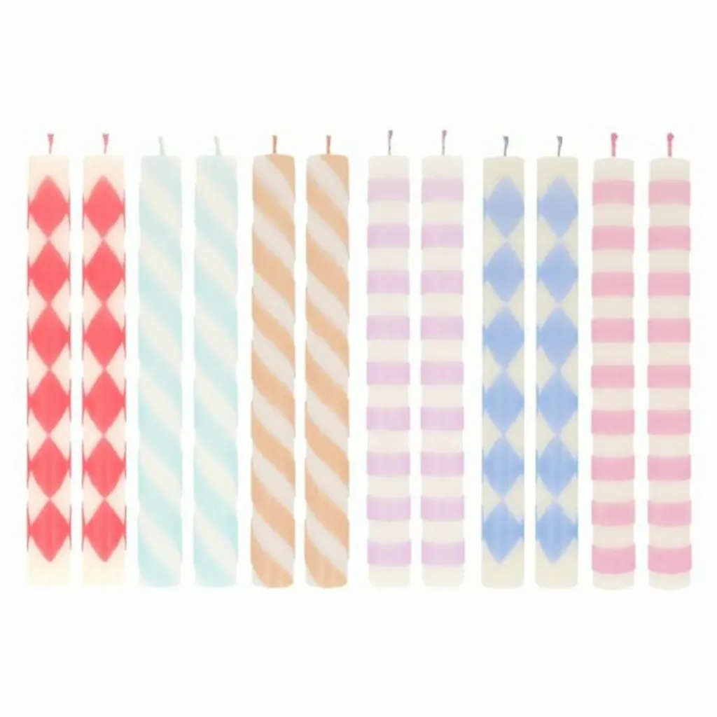 - Ajoutez une couche supplémentaire de style à n’importe quelle fête avec nos bougies de table à motifs. Ils sont parfaits comme centre de table, ou à placer sur la cheminée ou à des points stratégiques de la pièce pour une douce lueur. Et, si vous ne les allumez pas, vous pourrez les réutiliser encore et encore pour une touche déco. Les motifs vibrants et les mèches colorées en font également un merveilleux coffret cadeau.