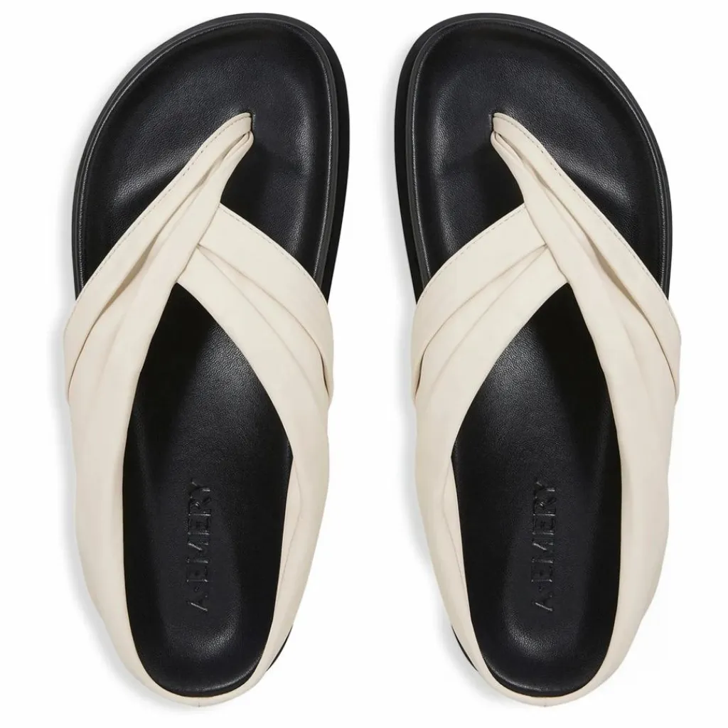 - La sandale Shaw, avec son assise plantaire moulée, présente deux généreuses brides froncées à la silhouette d’une tong, partant d’un seul point pour un look moderne.