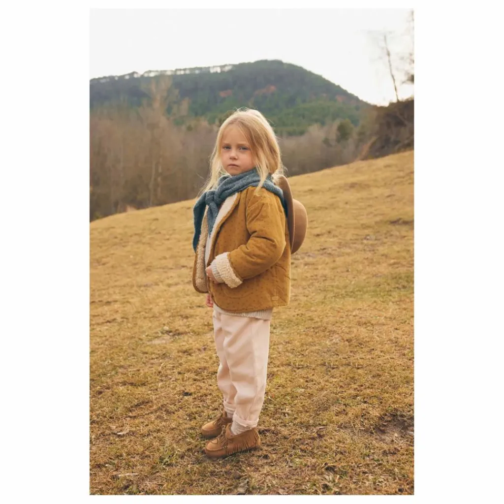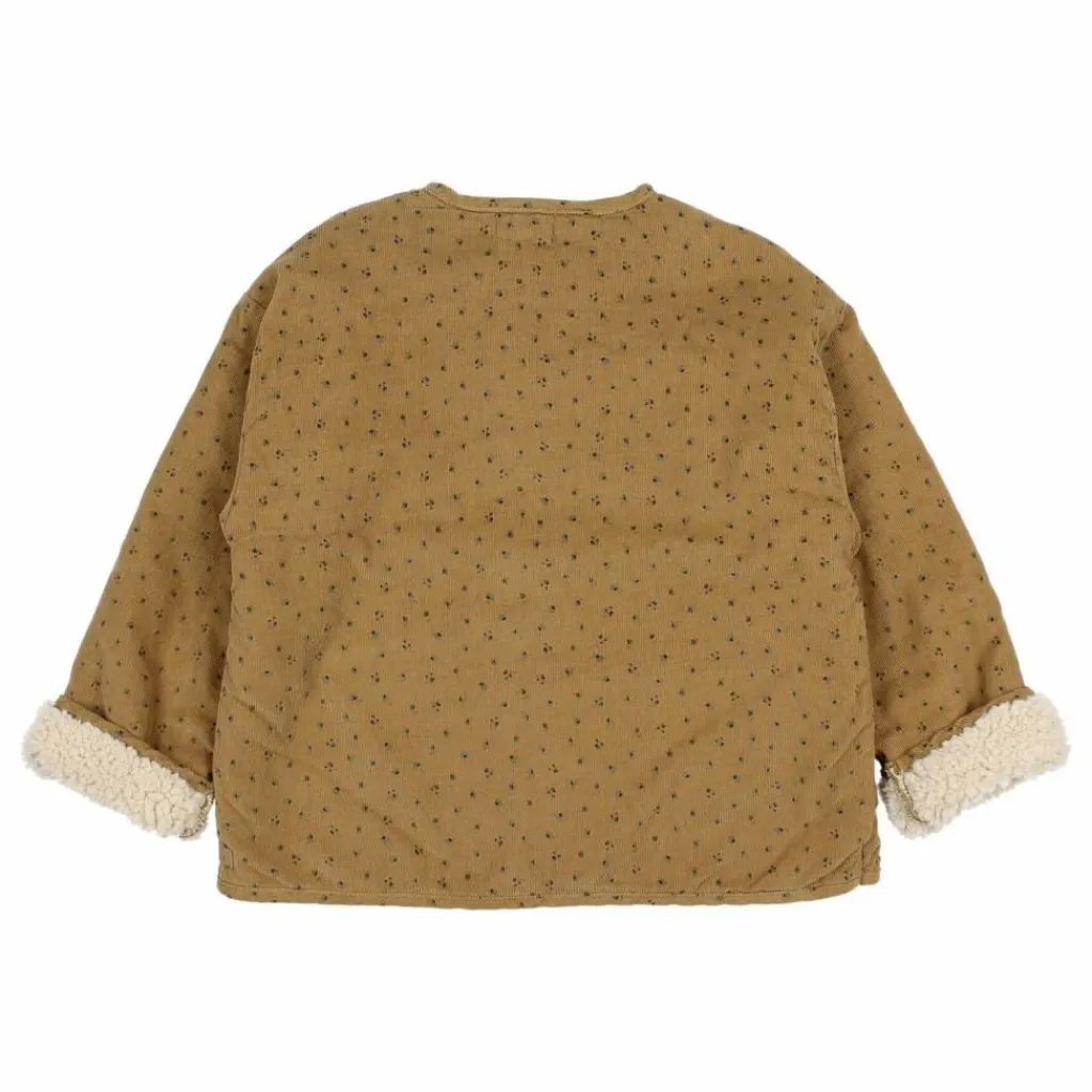 - Veste en micro velours côtelé avec imprimé « fall ». Doublure en nounours. Col rond avec boutonnage sur le devant. Boutons en bois. Poches en plastron sur le devant.
