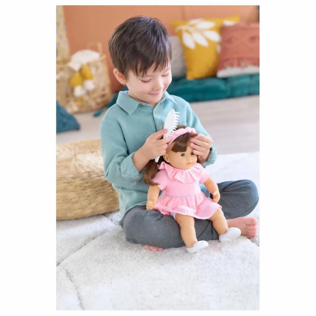 Découvrez Julie, le Grand Poupon de 36 cm à coiffer, parfait pour les petites mains ! Avec ses longs cheveux châtains et sa brosse incluse, elle invite aux jeux de coiffure. Son corps souple et léger la rend facile à manipuler, et elle peut même s’asseoir pour plus de possibilités de jeu. Julie séduit par son visage réaliste, sa peau douce au toucher, ses yeux marron dormeurs qui se ferment quand on la couche, et sa délicate senteur de vanille.