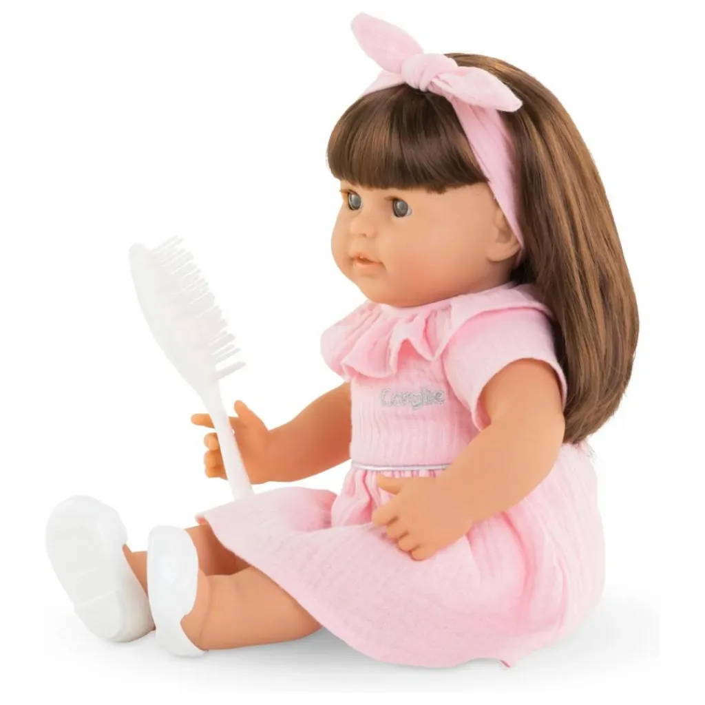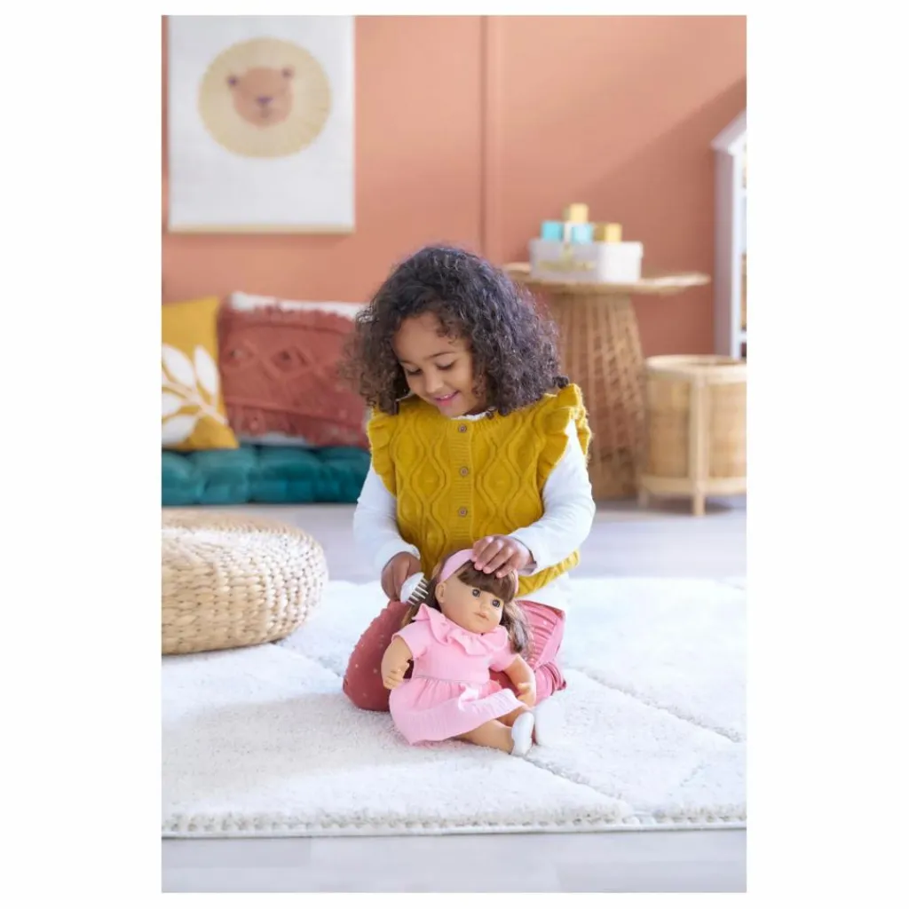 Elle porte une élégante tenue : une robe rose en gaze de coton, un bandeau assorti et des ballerines blanches. Julie est compatible avec les vêtements pour poupons de 36 cm et est idéale dès 3 ans.