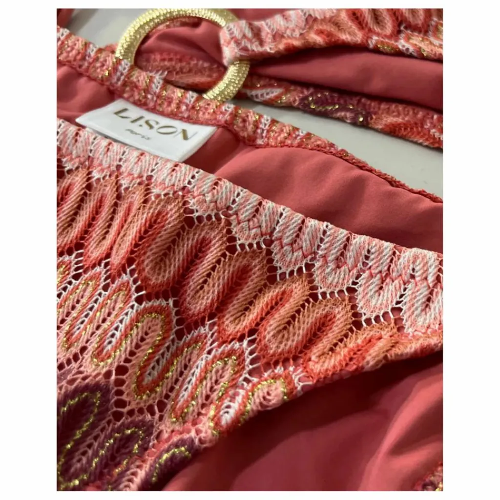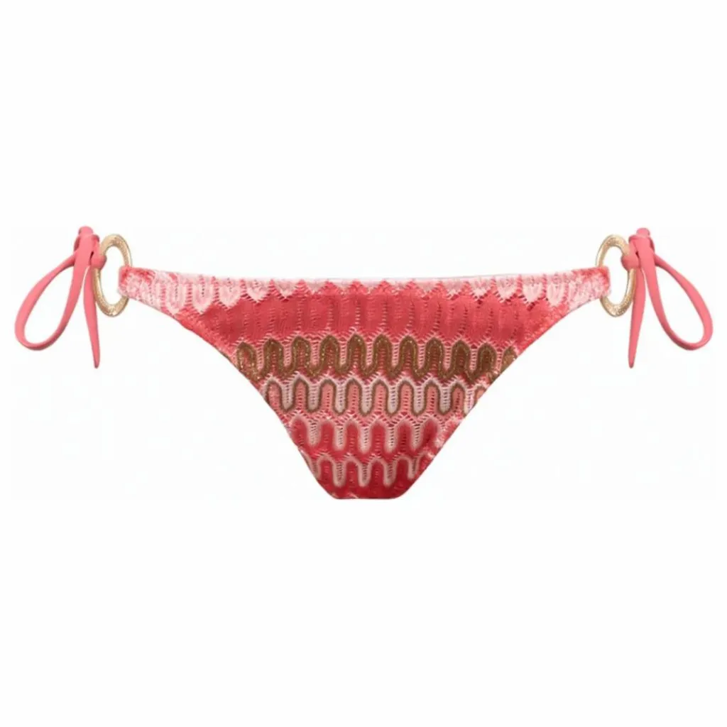 - Bas de maillot en crochet corail aux reflets dorés, rehaussé d’anneaux bijoux et de liens à nouer. Une pièce solaire et couture qui sublime la silhouette.