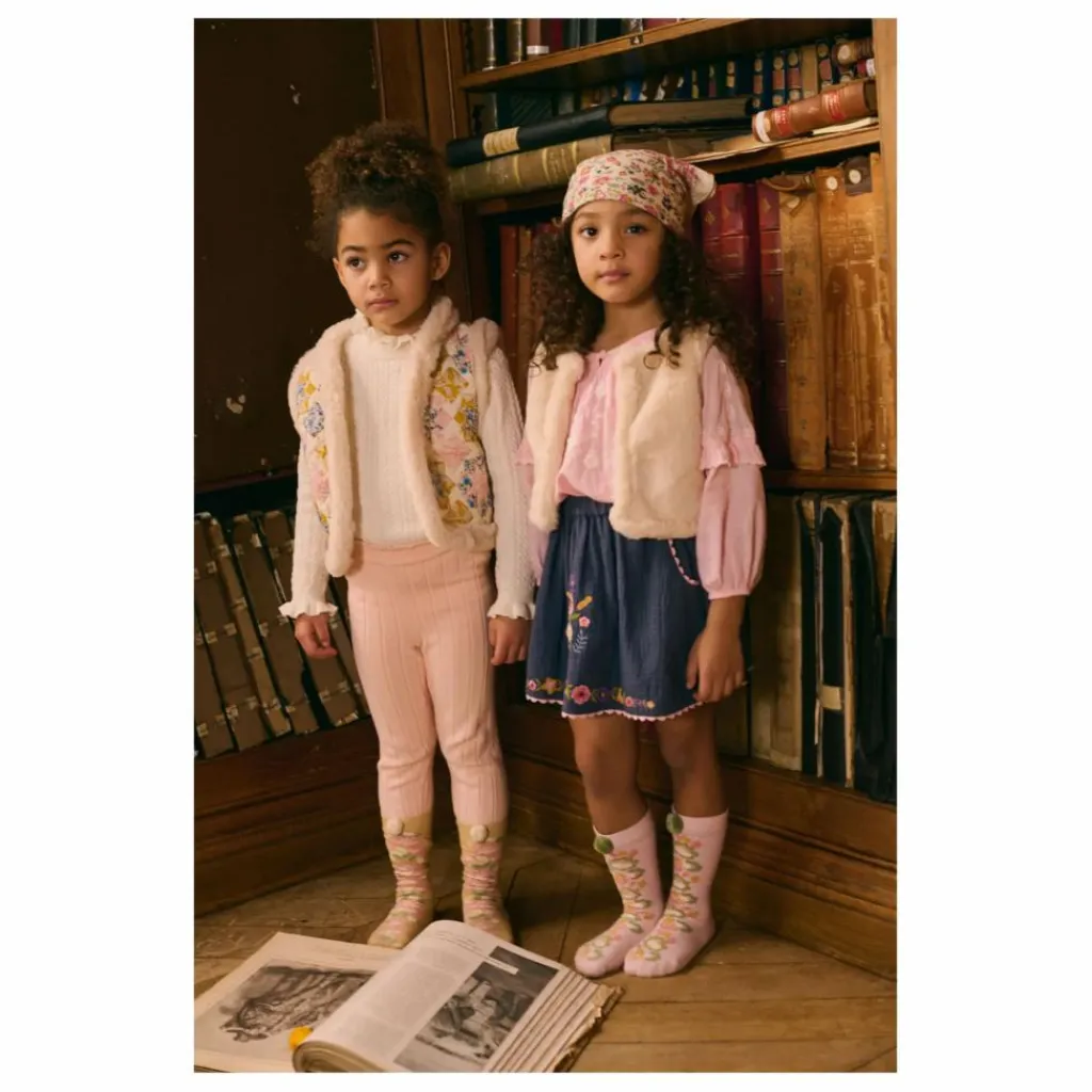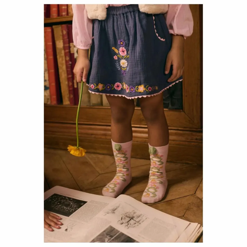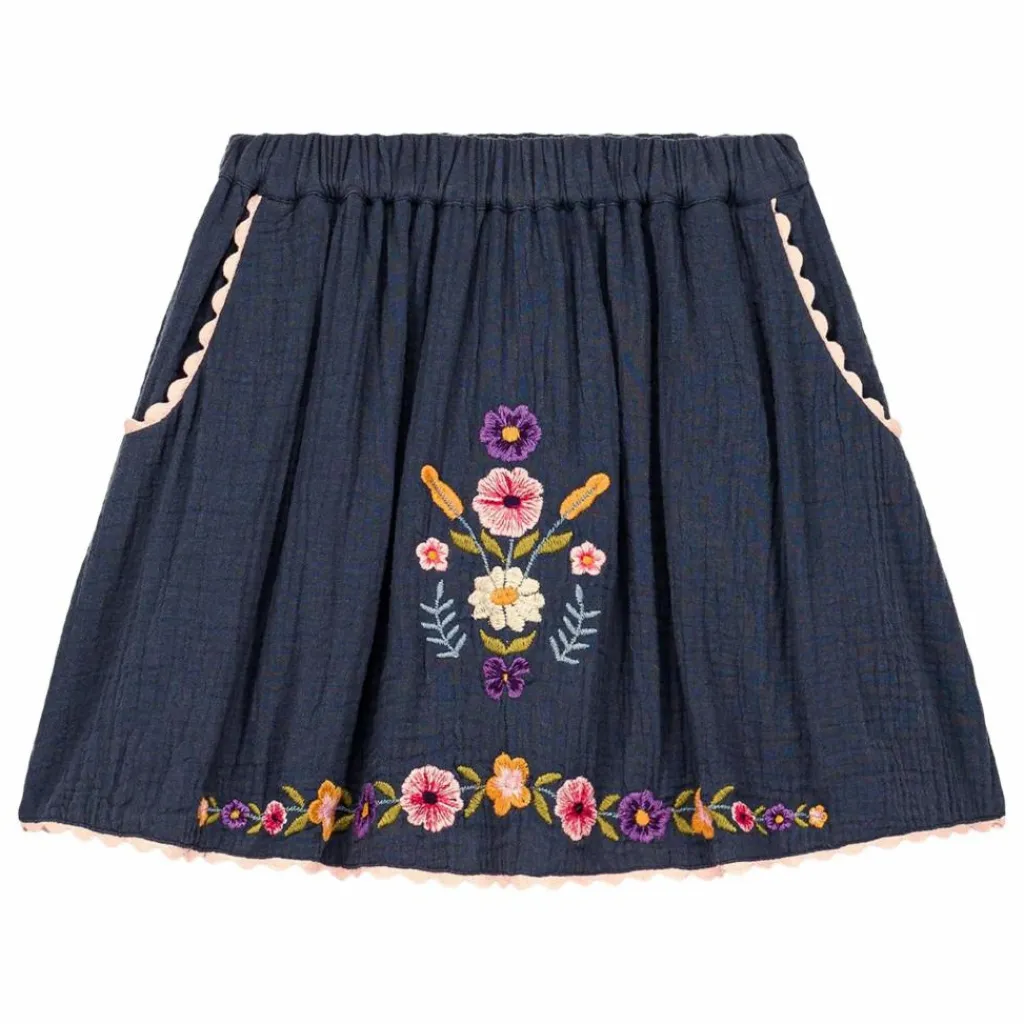 Motif fleuri brodé devant et frise fleurie brodée en bas de vêtement.