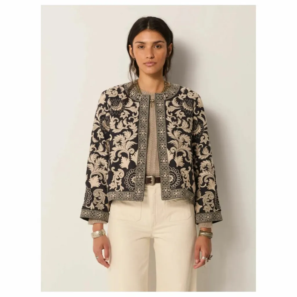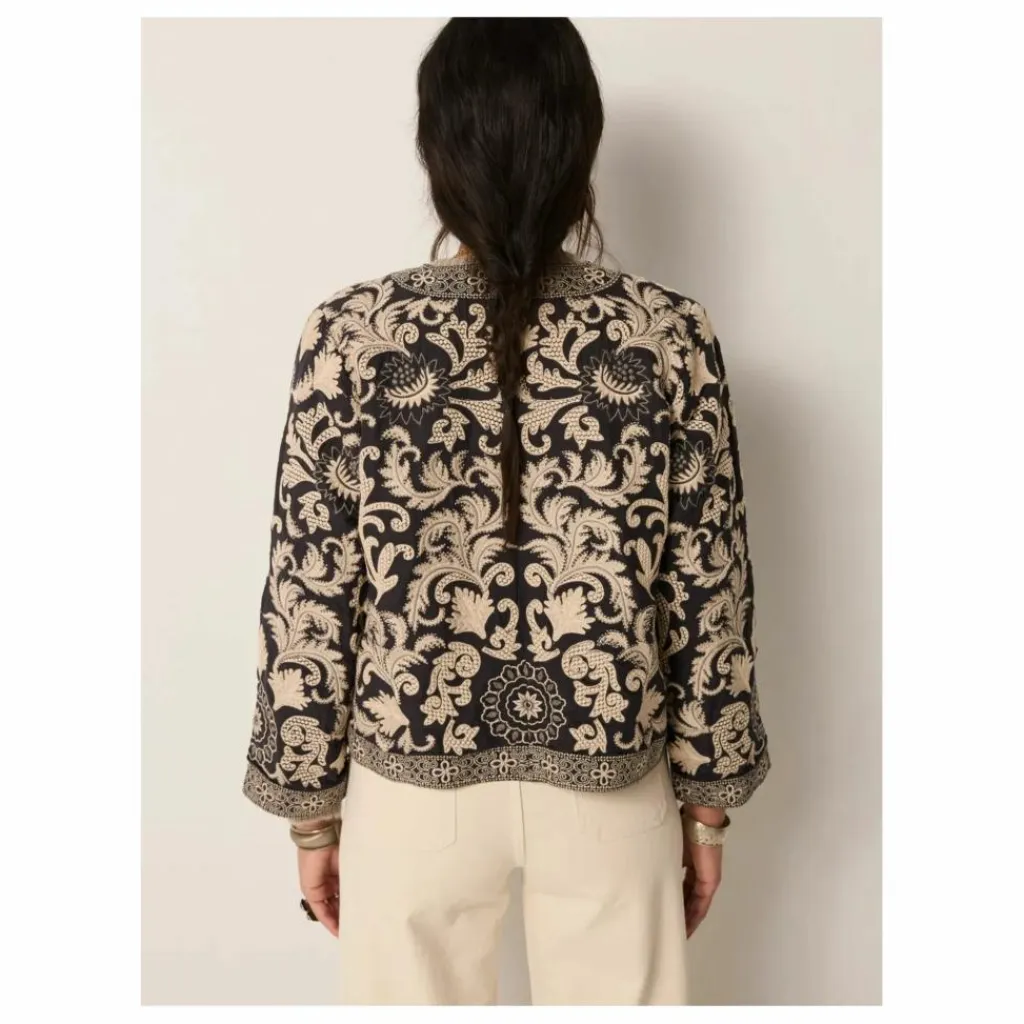 La broderie recouvre entièrement la surface, avec des bordures courant le long de la patte de boutonnage et de l’ourlet pour encadrer les fleurs. Un léger rembourrage apporte une structure discrète, créant ainsi une pièce affirmée sans être trop austère.