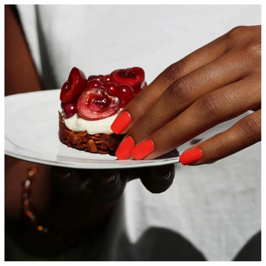 - BUTYL ACETATE, ETHYL ACETATE, NITROCELLULOSE, ADIPIC ACID/NEOPENTYL GLYCOL/TRIMELLITIC ANHYDRIDE COPOLYMER, ACETYL TRIBUTYL CITRATE, ALCOHOL, ISOPROPYL ALCOHOL, STEARALKONIUM BENTONITE, ACRYLATES COPOLYMER, CI 73360 (RED 30), HEA IPDI ISOCYANURATE TRIMER/POLYCAPROLACTONE DIOL COPOLYMER, CI 77891 (TITANIUM DIOXIDE), TRIS-HEA IPDI ISOCYANURATE TRIMER, DIACETONE ALCOHOL, SORBIC ACID, PHOSPHORIC ACID, N-BUTYL ALCOHOL, CI 19140 (YELLOW 5 LAKE), CI 12085 (RED 36)