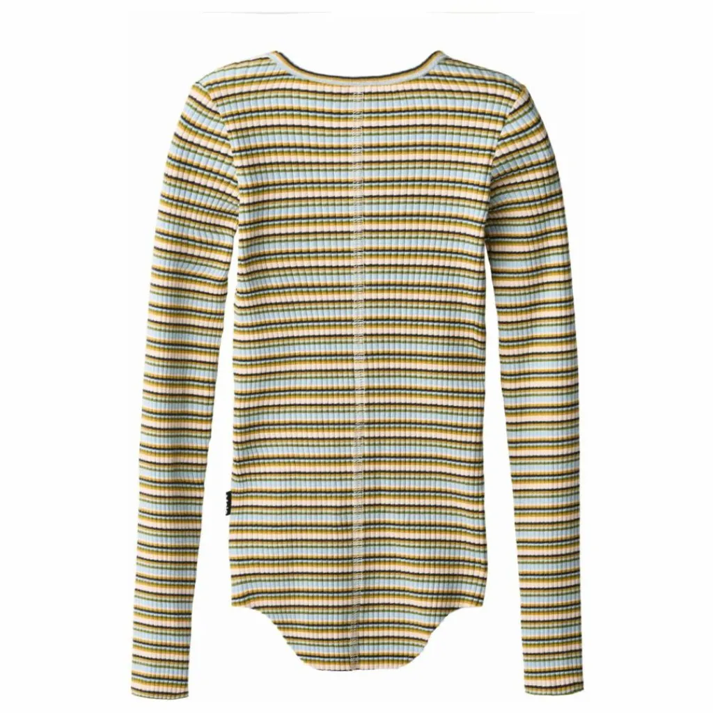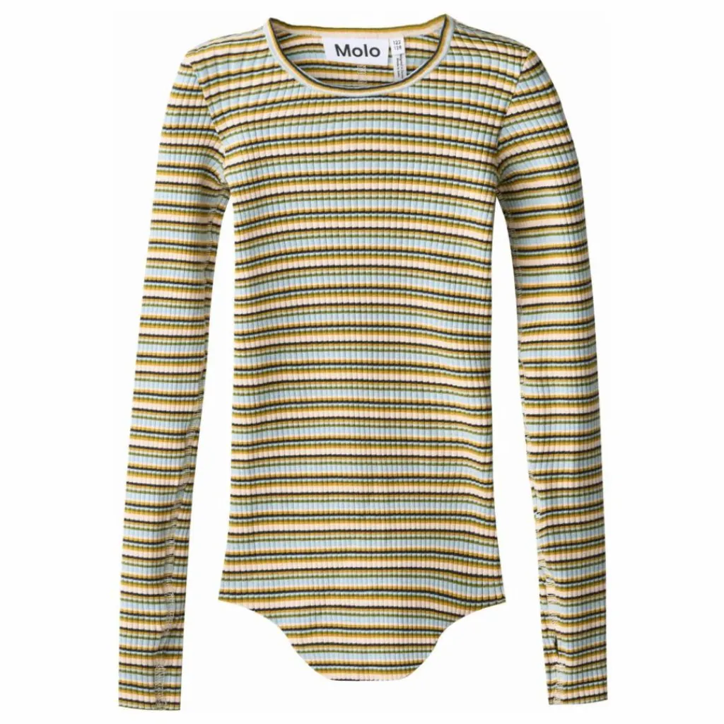 - Ce haut rayé à manches longues de Molo est confectionné en côte de coton biologique extensible et présente une coupe près du corps. Il présente une encolure ronde, des bords bruts sur les deux manches avec des trous pour les pouces, une couture verticale au milieu du dos et un bord brut arrondi à la taille.