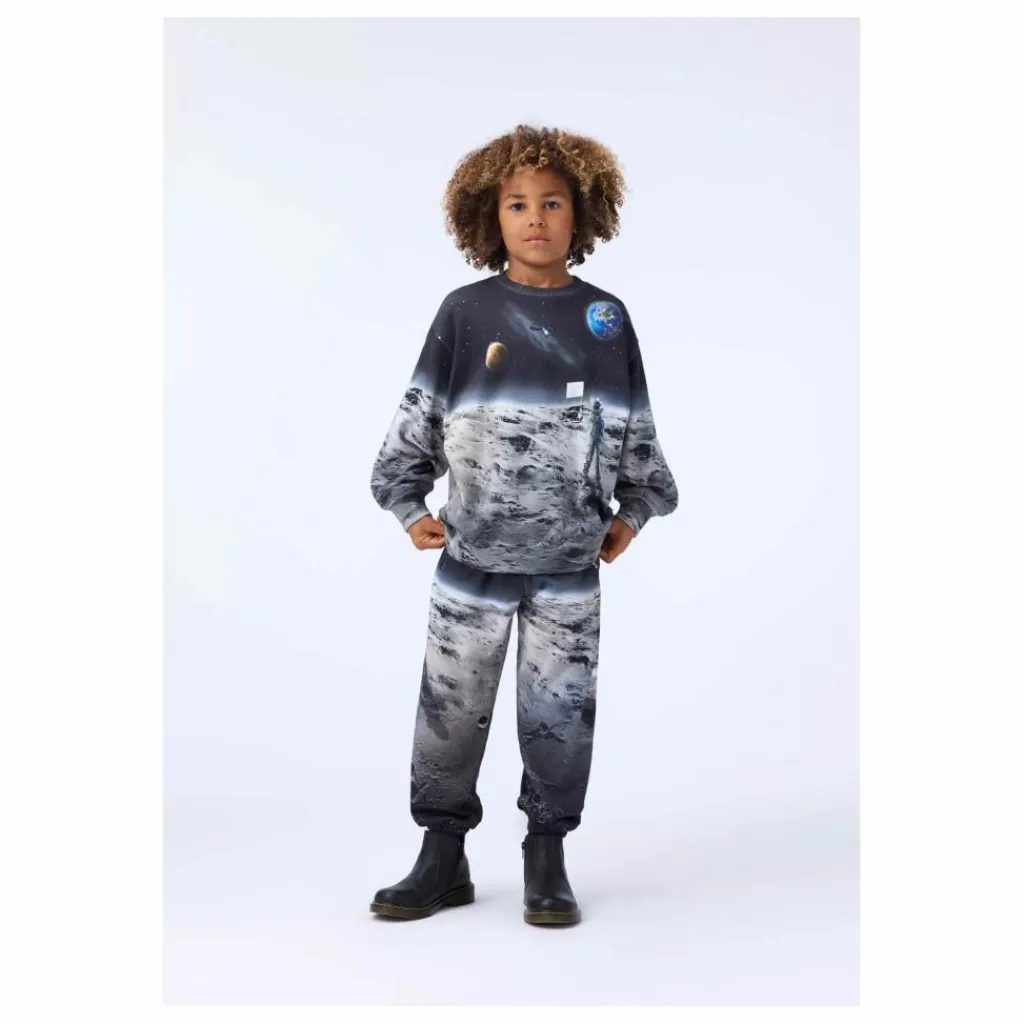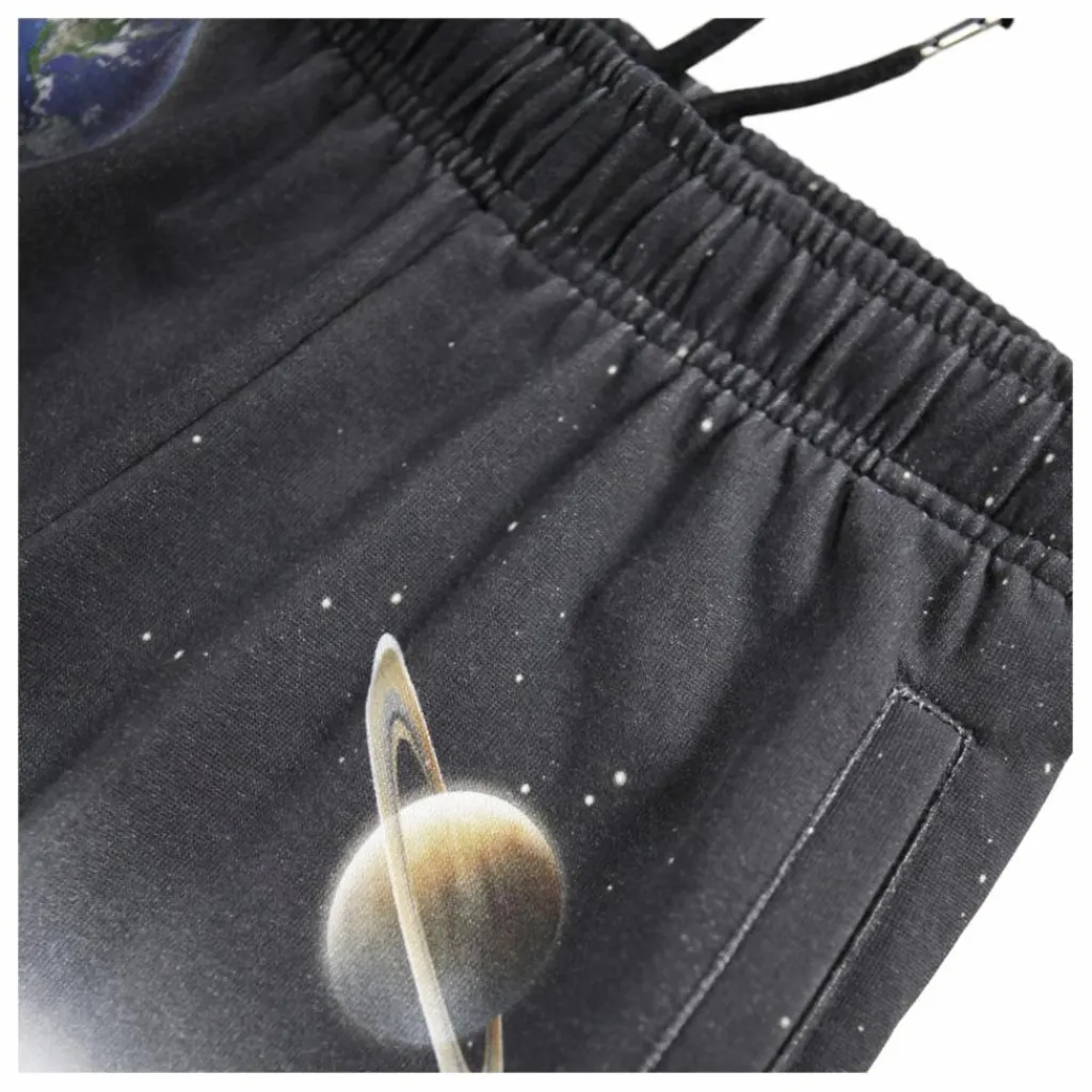 - Ce pantalon de survêtement multicolore en coton biologique de Molo a une taille élastique réglable, des poches latérales, une poche arrière simple et un élastique autour des chevilles. Le pantalon de survêtement a une coupe régulière et présente un magnifique imprimé de la lune et des planètes.