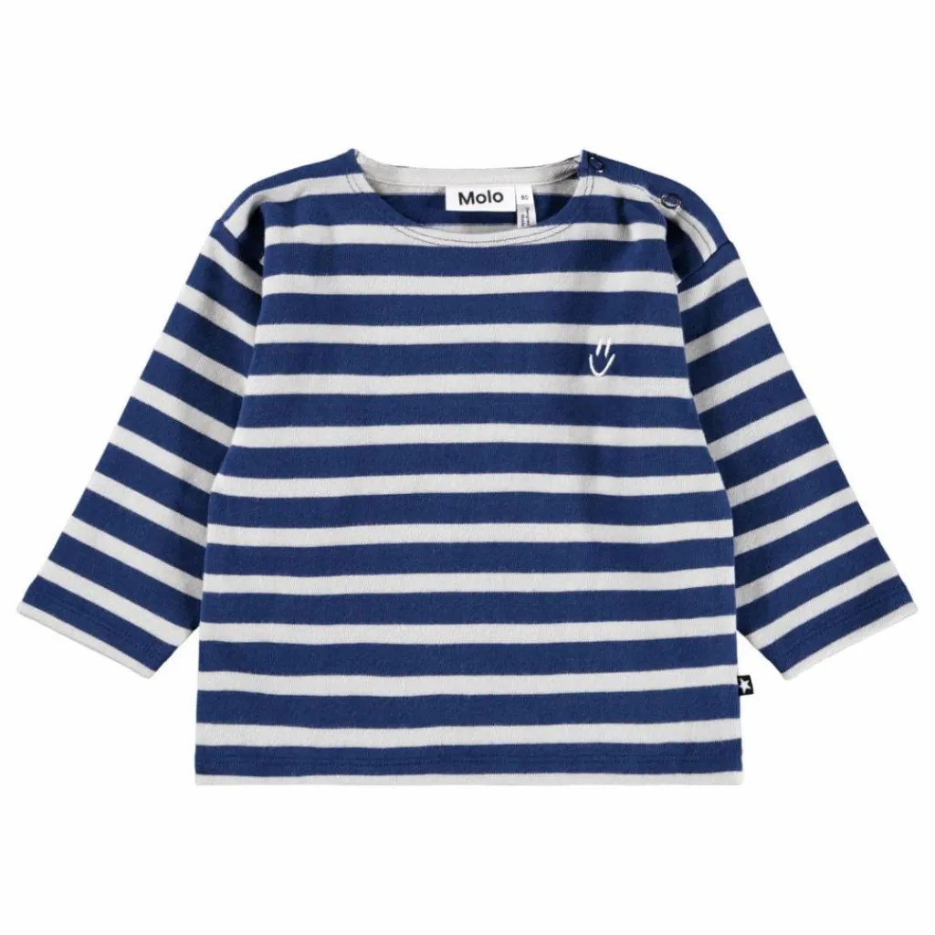 - Ce haut bleu à manches longues de Molo est fabriqué en jersey de coton biologique et comporte un petit visage blanc souriant brodé sur la poitrine. Il présente une coupe ample, une encolure ronde et une fermeture à bouton sur l’épaule gauche.