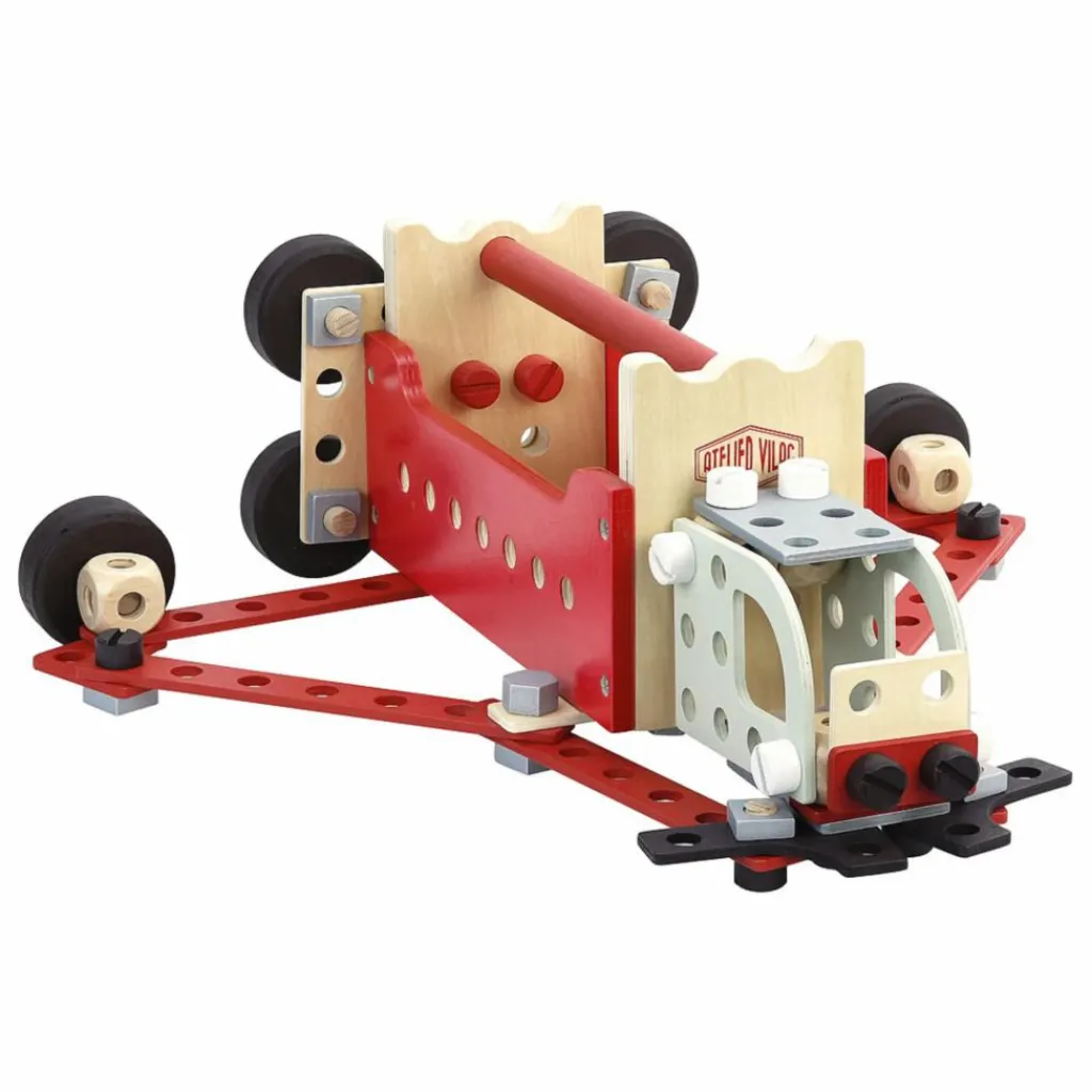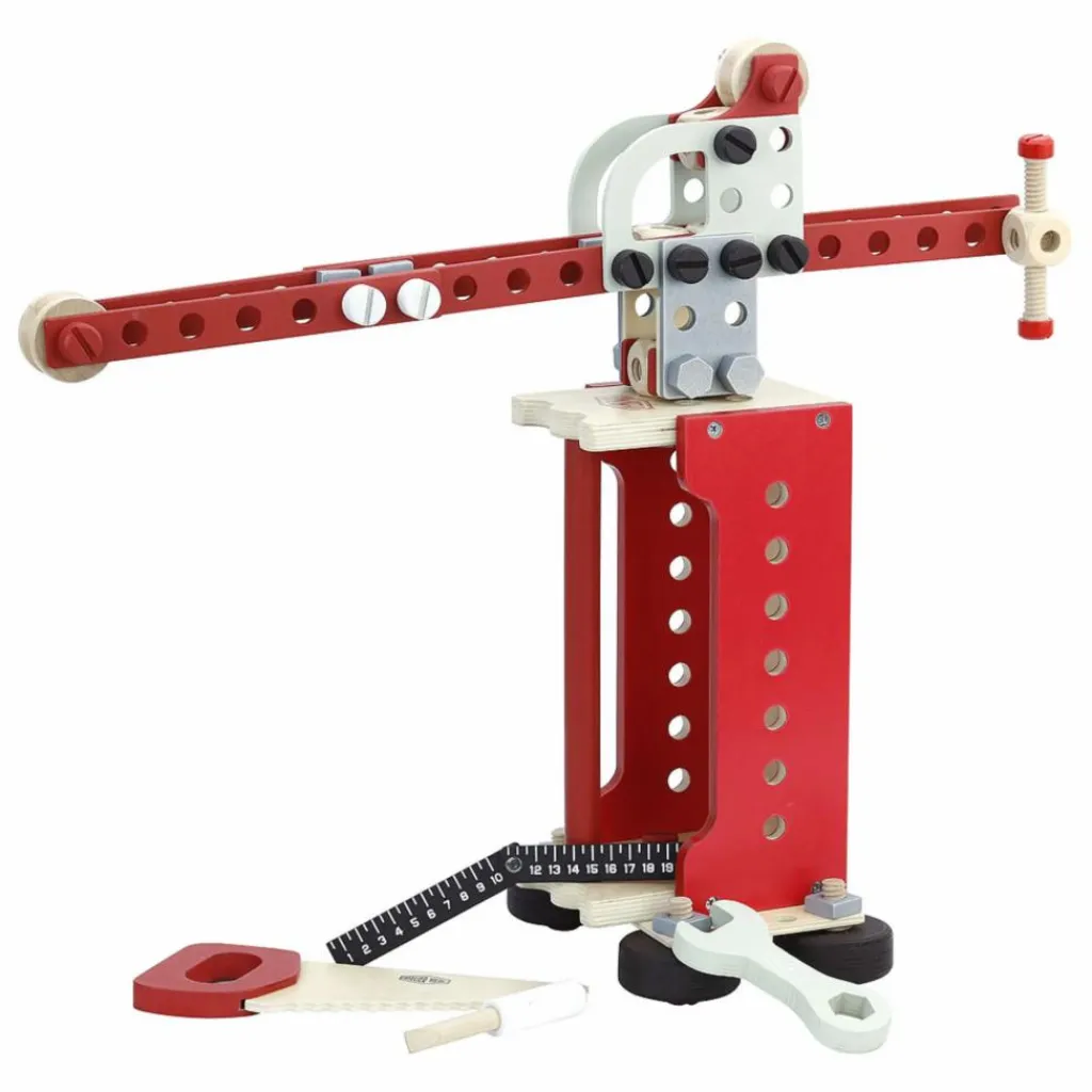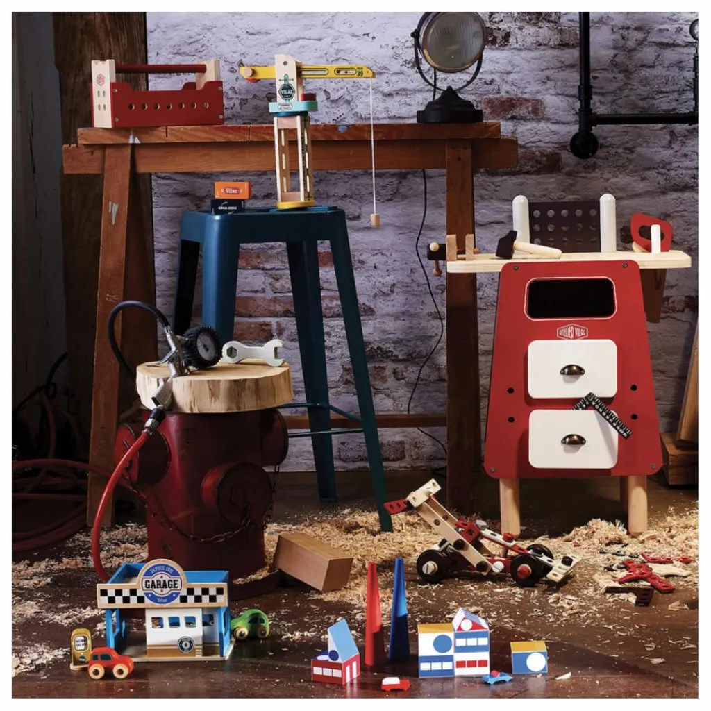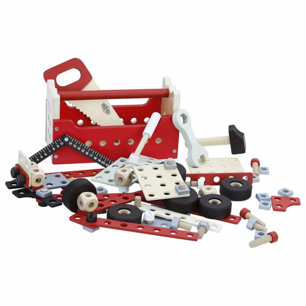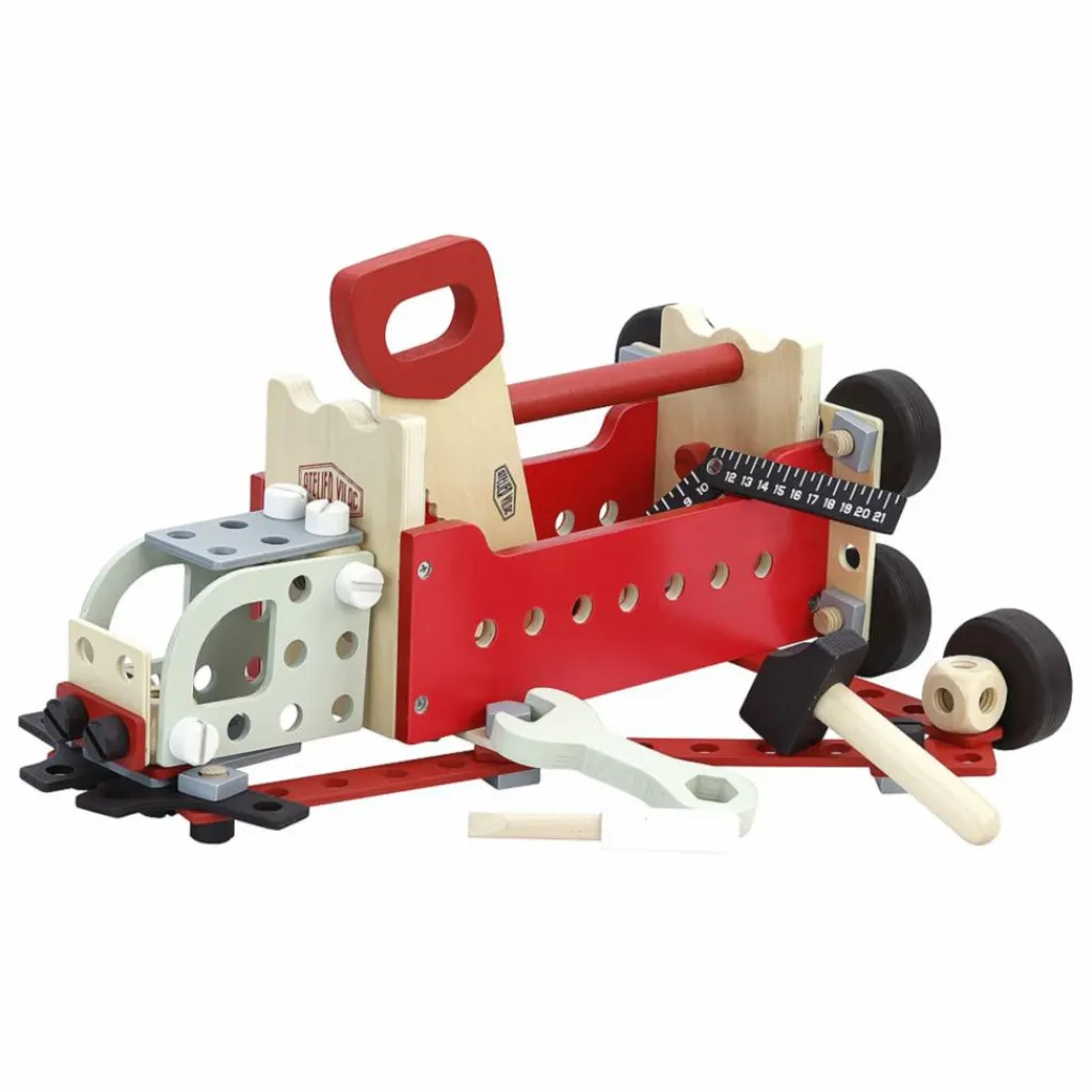 - Cette boîte à outils réversible sert de base à de nombreuses constructions et se transforme en établi quand on la retourne. Vos enfants pourront ainsi visser, tourner, scier, marteler et mesurer comme les grands grâce aux nombreux accessoires. En assemblant les écrous, boulons et planchettes grâce aux modèles fournis, la boîte à outils se transformera en camion, grue et robot et bien plus encore suivant l’imagination de vos enfants.